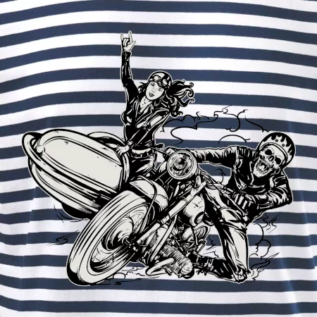Tričko pre motorkára, na ktorom je motorkár kostlivec na motorke. Sajdkára pri motorke je skvelá možnosť ako sa môže pri Tvojom pekelnom stroji objaviť aj krásne dievča stopárka. Motorka je životný štýl, tak to ukáž tým, že si kúpiš tričko s motorkou. Pokiaľ si pravý motorkár máš rád rýchlosť, motorka so sajdkárou je motív ideálny pre Teba.