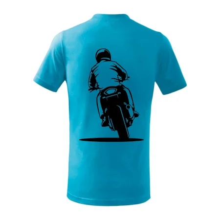 Detské tričko strednej gramáže s bočnými švami. Úzky priekrčník s prídavkom 5% elastanu. Vnútorná časť zadného priekrčníka začistená tkanou páskou. Spevnený ramenný šev.