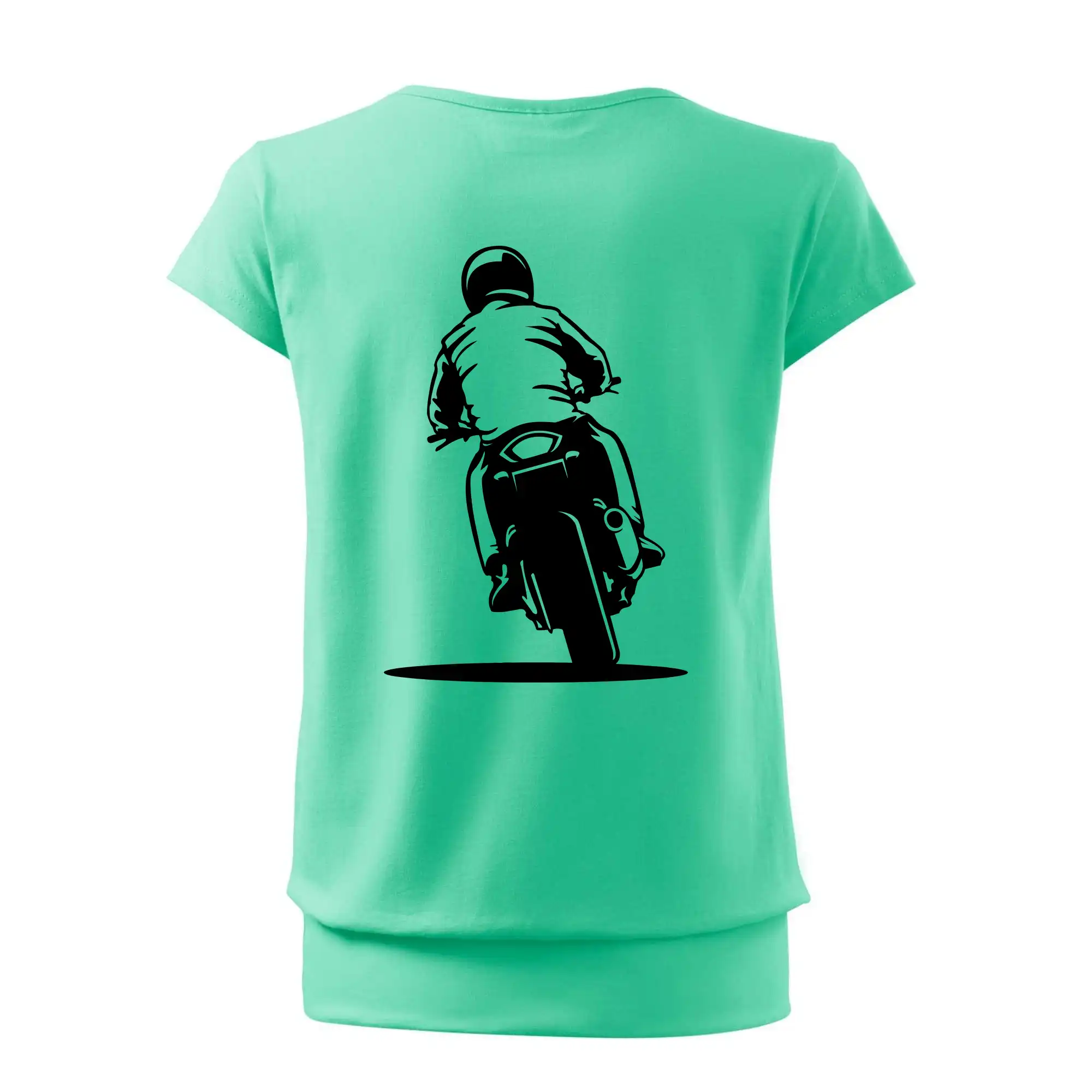 Trendové dámske tričko s veľmi krátkym rukávom, voľnejšieho strihu, v dolnom kraji všité do širokého lemu. Okrúhly priekrčník s úzkym lemom zo zhodného materiálu.