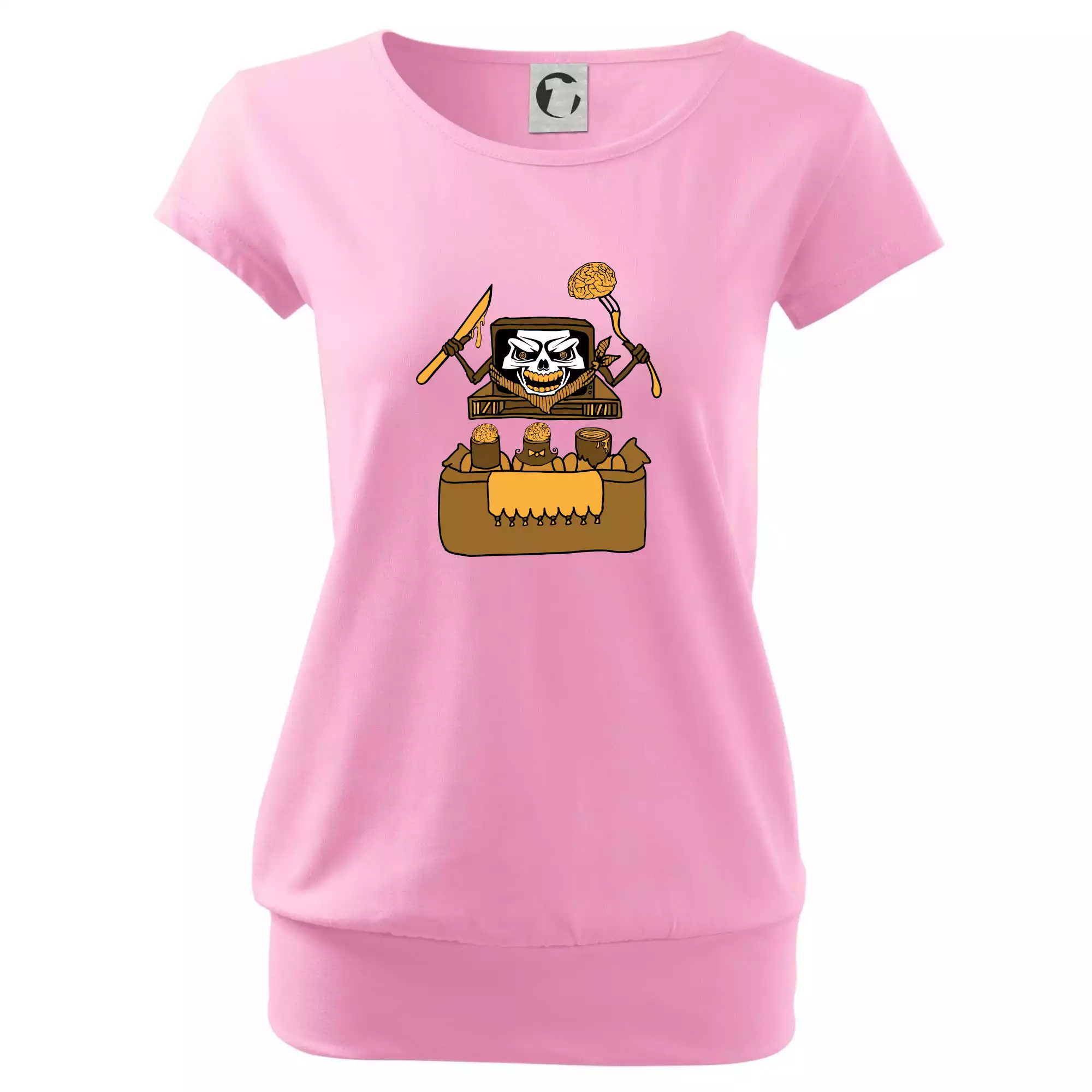 Trendové dámske tričko s veľmi krátkym rukávom, voľnejšieho strihu, v dolnom kraji všité do širokého lemu. Okrúhly priekrčník s úzkym lemom zo zhodného materiálu.