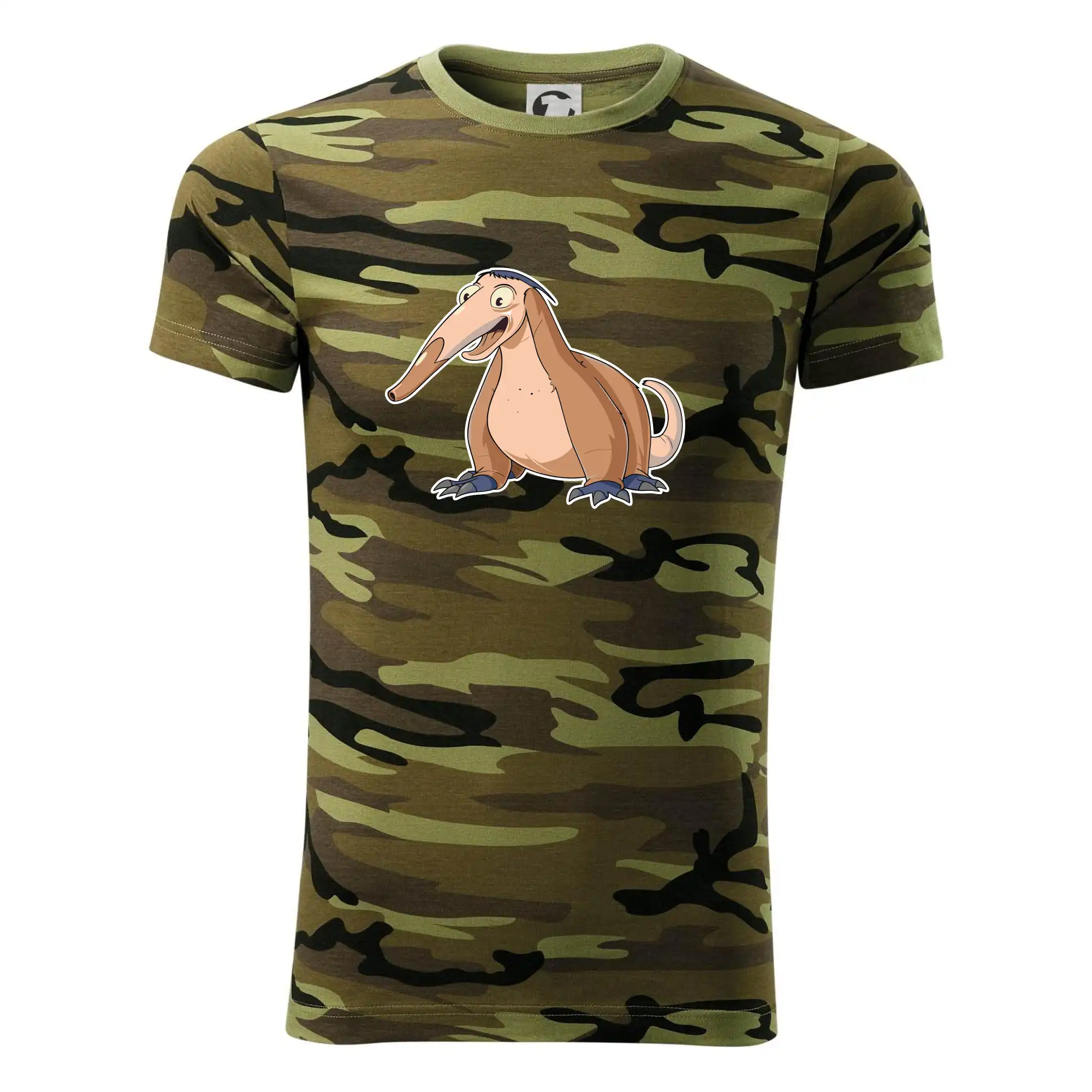 Tričko strednej gramáže vo farbách camouflage. Strih s bočnými švami. Lem priekrčníku z rebrového úpletu s prídavkom 5% elastanu. Vnútorná časť zadného priekrčníka začistená páskou vo farbe camouflage.