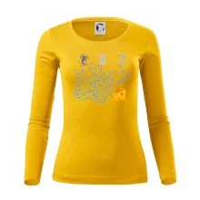 Tričko myšací hlavolam je pre Teba to pravé, ak si milovník hlavolamov a hádaniek alebo ak máš rád myši. Tri myši, jeden syr, jedno bludisko, ktorá myška nájde cestu bludiskom ako prvá? Ja si myslím, že vyhraje biely myš. Tričko je vhodný darček pre dieťa.
