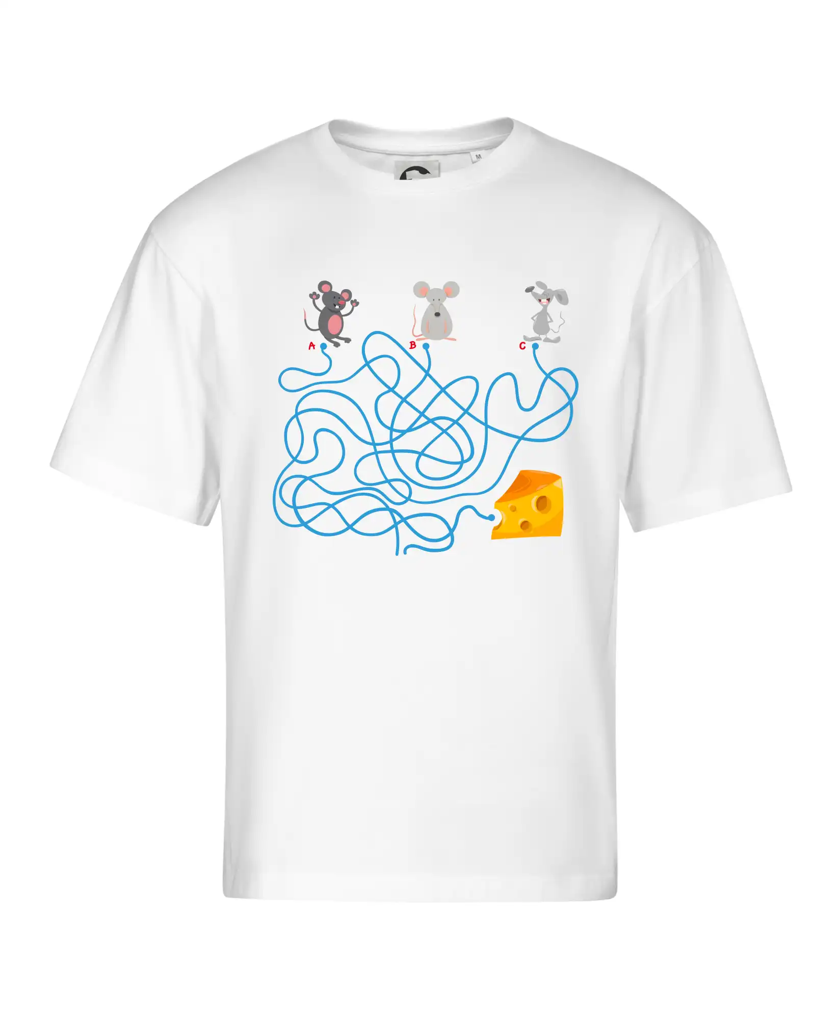 Tričko myšací hlavolam je pre Teba to pravé, ak si milovník hlavolamov a hádaniek alebo ak máš rád myši. Tri myši, jeden syr, jedno bludisko, ktorá myška nájde cestu bludiskom ako prvá? Ja si myslím, že vyhraje biely myš. Tričko je vhodný darček pre dieťa.