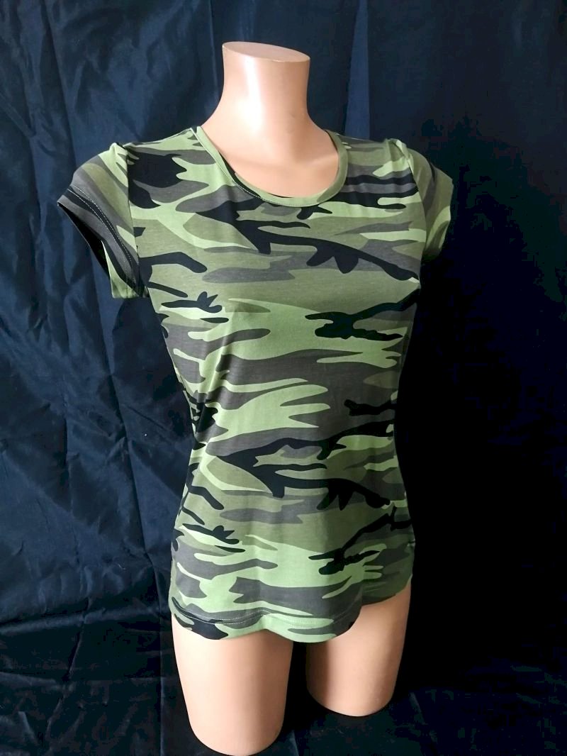 Tričko strednej gramáže vo farbách camouflage. Strih s bočnými švami. Lem priekrčníku z rebrového úpletu s prídavkom 5% elastanu. Vnútorná časť zadného priekrčníka začistená páskou vo farbe camouflage.