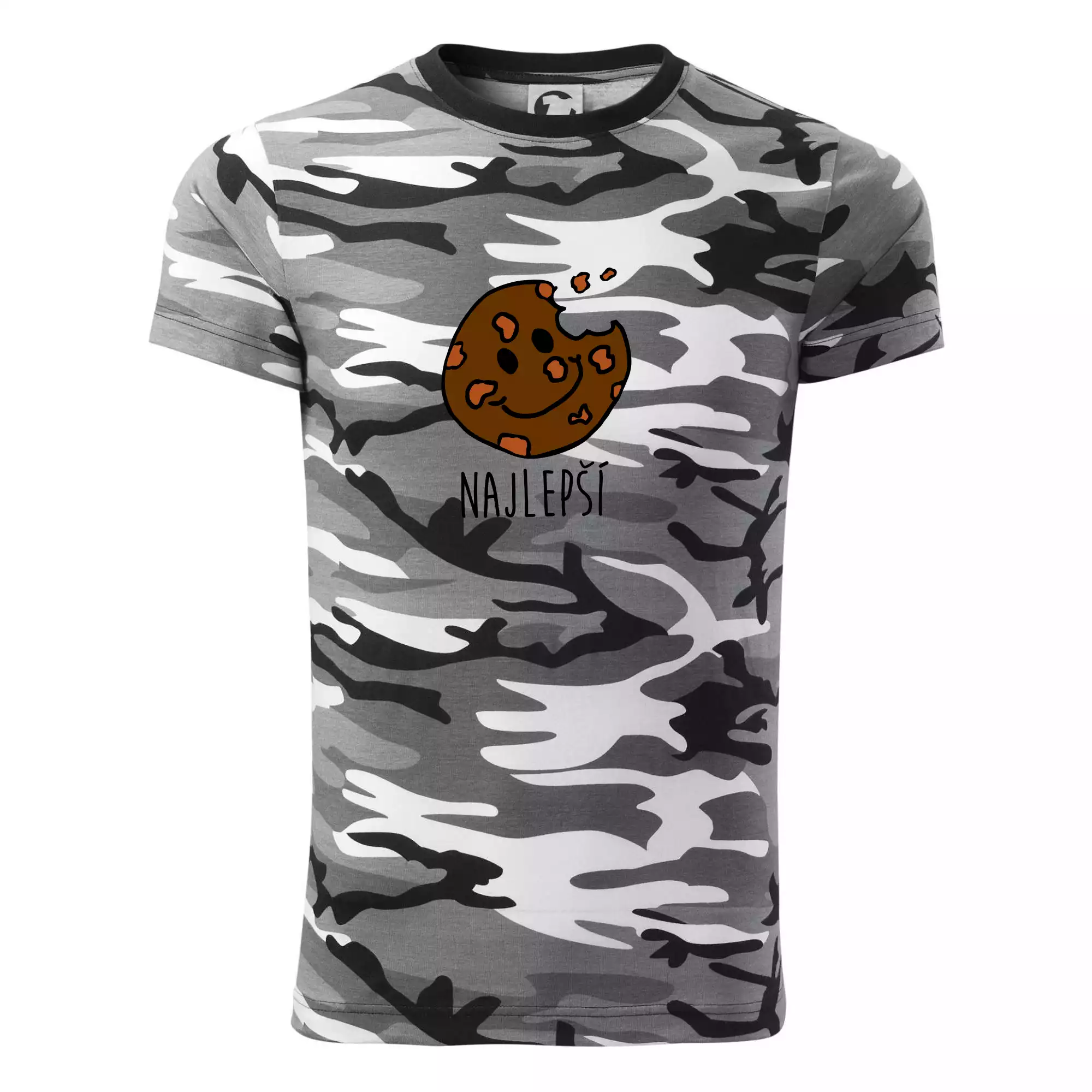 Tričko strednej gramáže vo farbách camouflage. Strih s bočnými švami. Lem priekrčníku z rebrového úpletu s prídavkom 5% elastanu. Vnútorná časť zadného priekrčníka začistená páskou vo farbe camouflage.
