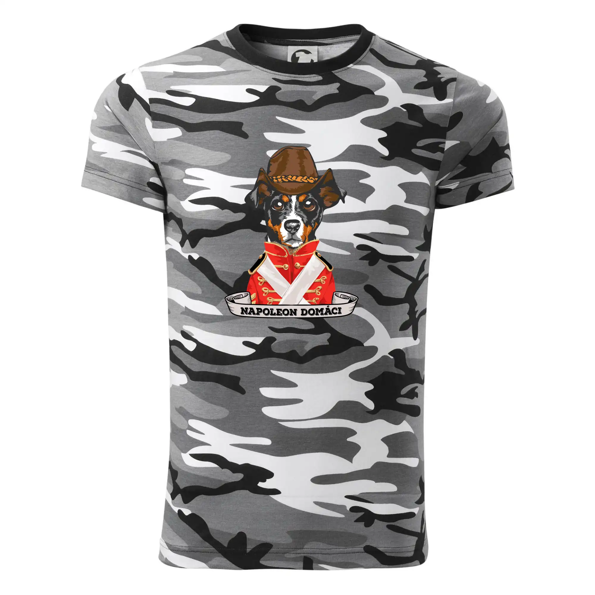 Tričko strednej gramáže vo farbách camouflage. Strih s bočnými švami. Lem priekrčníku z rebrového úpletu s prídavkom 5% elastanu. Vnútorná časť zadného priekrčníka začistená páskou vo farbe camouflage.