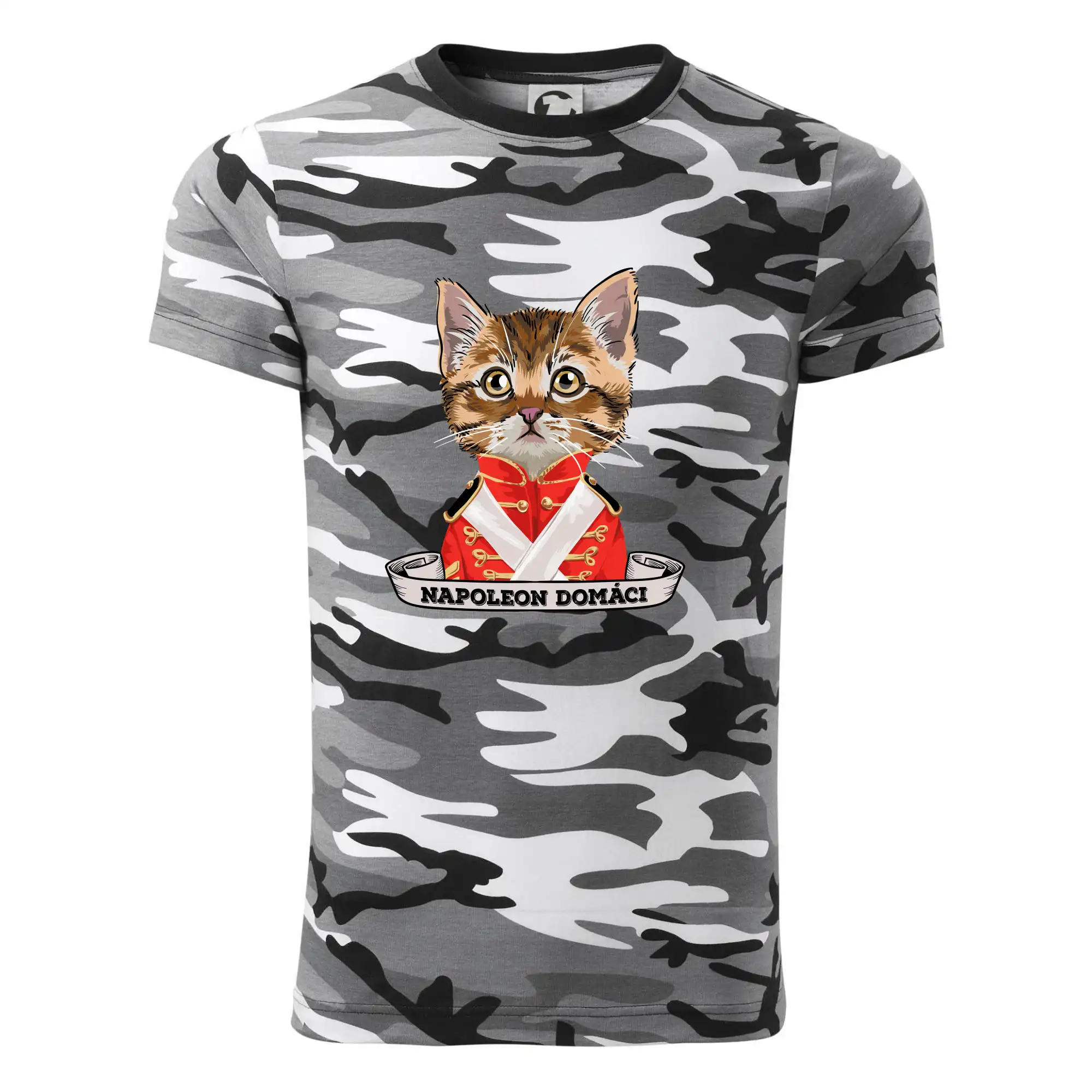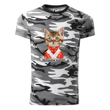Tričko strednej gramáže vo farbách camouflage. Strih s bočnými švami. Lem priekrčníku z rebrového úpletu s prídavkom 5% elastanu. Vnútorná časť zadného priekrčníka začistená páskou vo farbe camouflage.