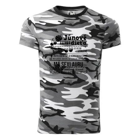 Tričko strednej gramáže vo farbách camouflage. Strih s bočnými švami. Lem priekrčníku z rebrového úpletu s prídavkom 5% elastanu. Vnútorná časť zadného priekrčníka začistená páskou vo farbe camouflage.