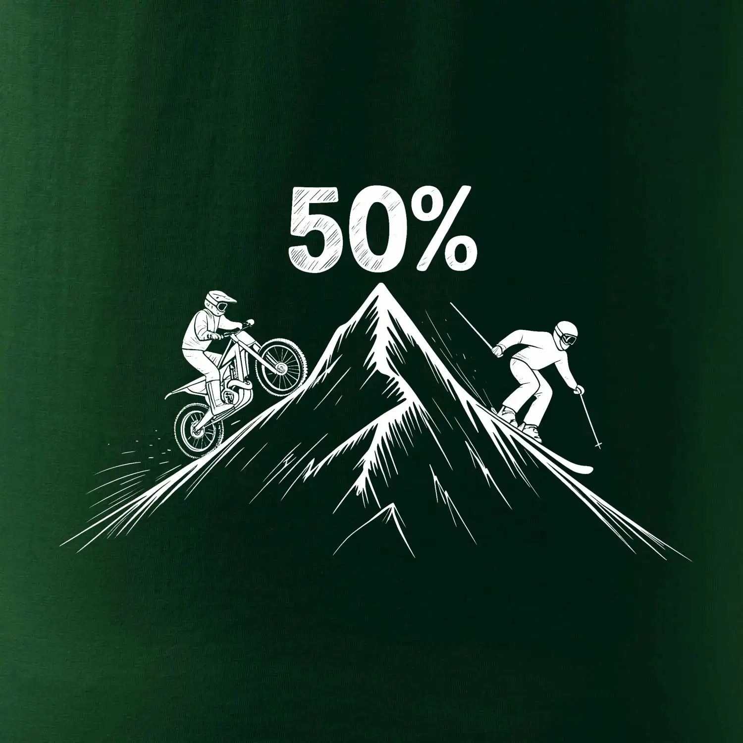 Tento motiv je parádní volba pro každého cyklistu, lyžaře nebo sportovce, který slaví půlstoletí na světě! Středový kruh zdobí výrazná číslice 50, kterou lemují stylizované obrázky MOTORKY a lyží – jasná zpráva všem kolem: tahle životní trasa vede přes trail i sjezdovku v plné parádě! Kombinace sportovních symbolů a moderní typografie dodává tričku energii a svěžest, která sluší každému dynamickému oslavenci.