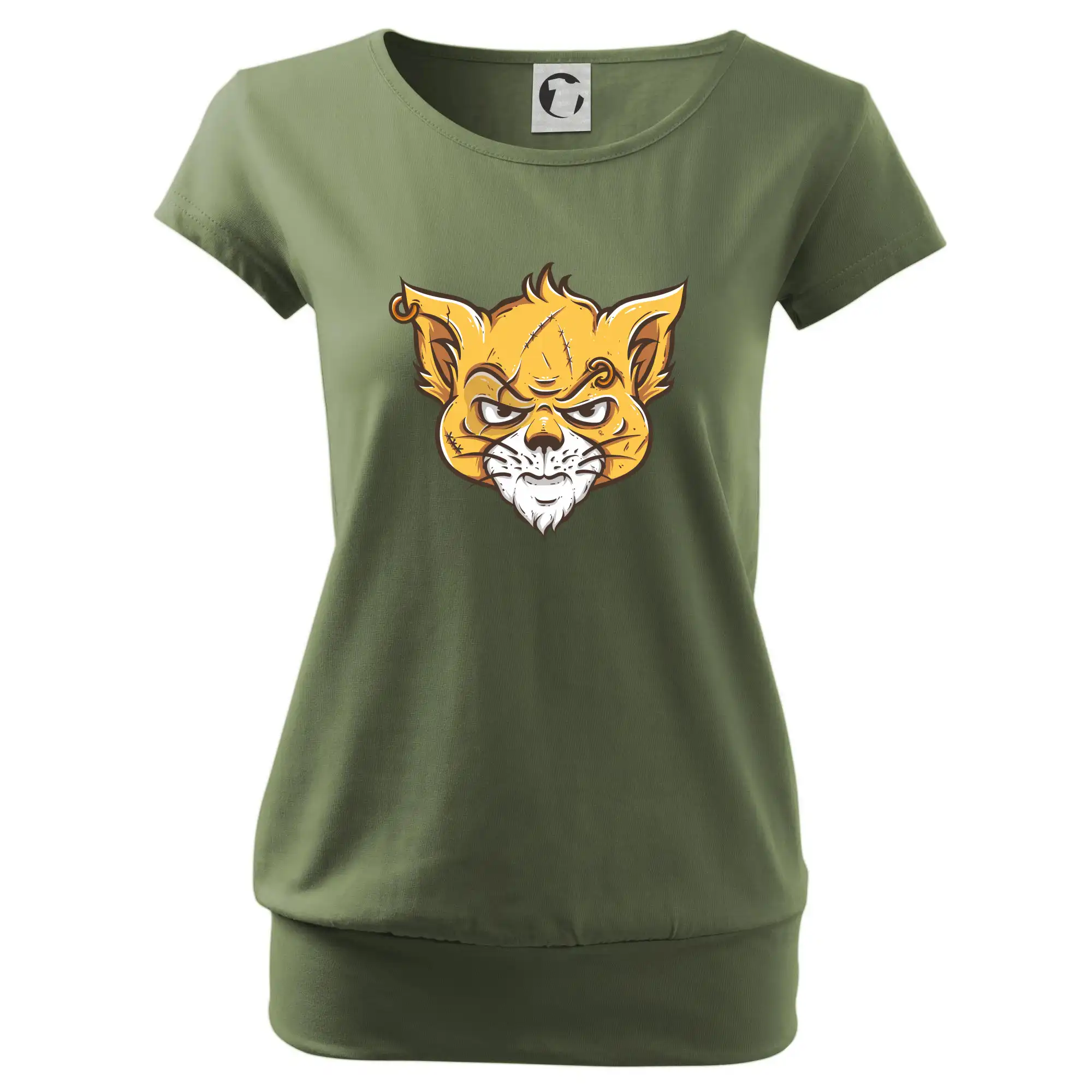 Trendové dámske tričko s veľmi krátkym rukávom, voľnejšieho strihu, v dolnom kraji všité do širokého lemu. Okrúhly priekrčník s úzkym lemom zo zhodného materiálu.