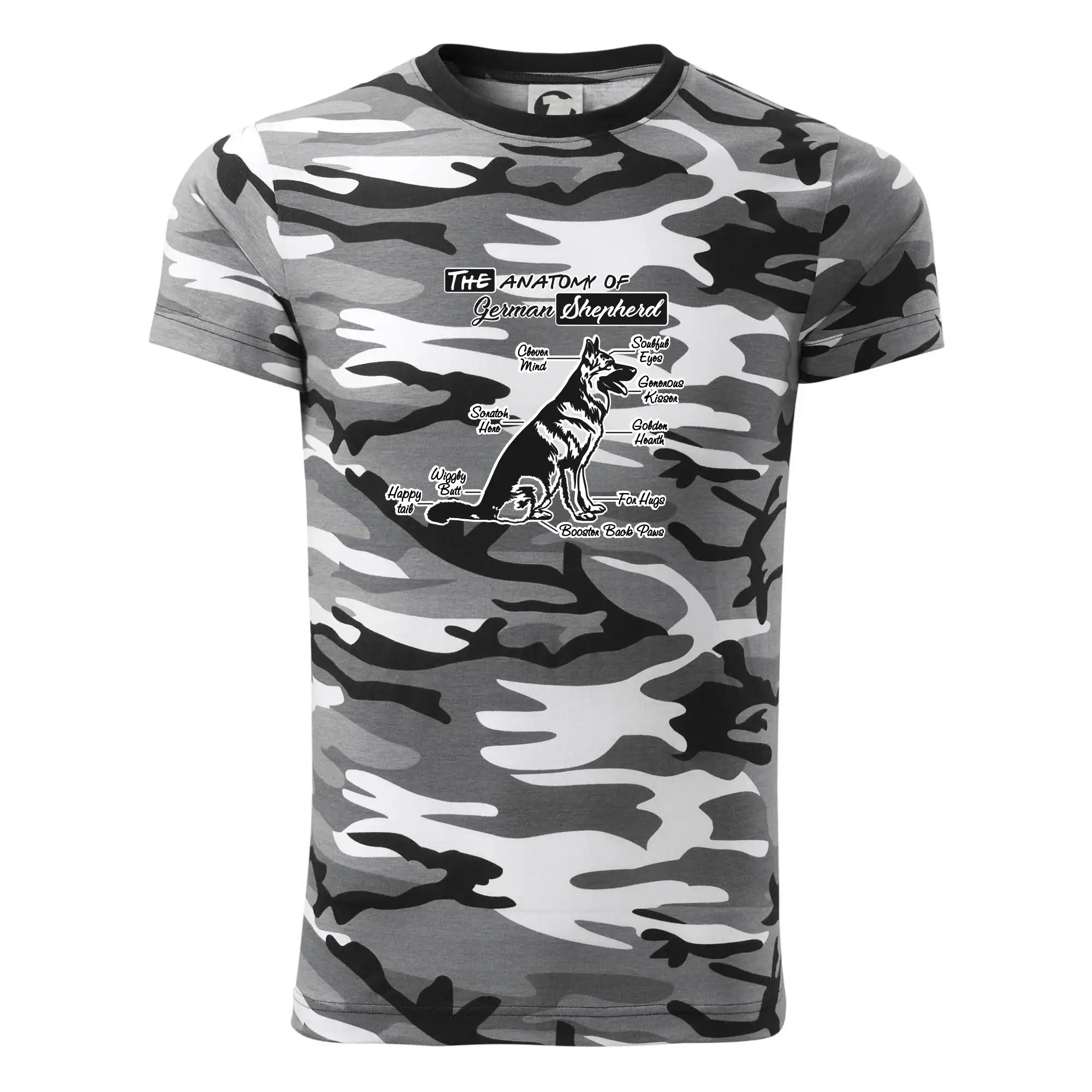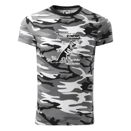 Tričko strednej gramáže vo farbách camouflage. Strih s bočnými švami. Lem priekrčníku z rebrového úpletu s prídavkom 5% elastanu. Vnútorná časť zadného priekrčníka začistená páskou vo farbe camouflage.