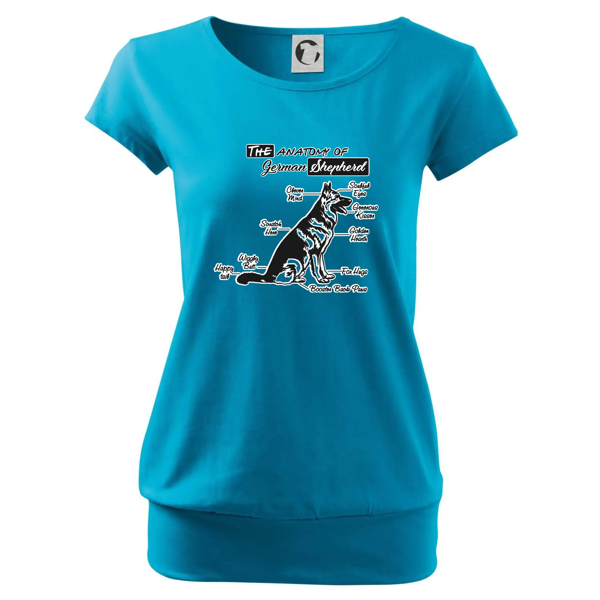 Trendové dámske tričko s veľmi krátkym rukávom, voľnejšieho strihu, v dolnom kraji všité do širokého lemu. Okrúhly priekrčník s úzkym lemom zo zhodného materiálu.
