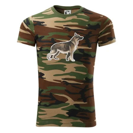 Tričko strednej gramáže vo farbách camouflage. Strih s bočnými švami. Lem priekrčníku z rebrového úpletu s prídavkom 5% elastanu. Vnútorná časť zadného priekrčníka začistená páskou vo farbe camouflage.
