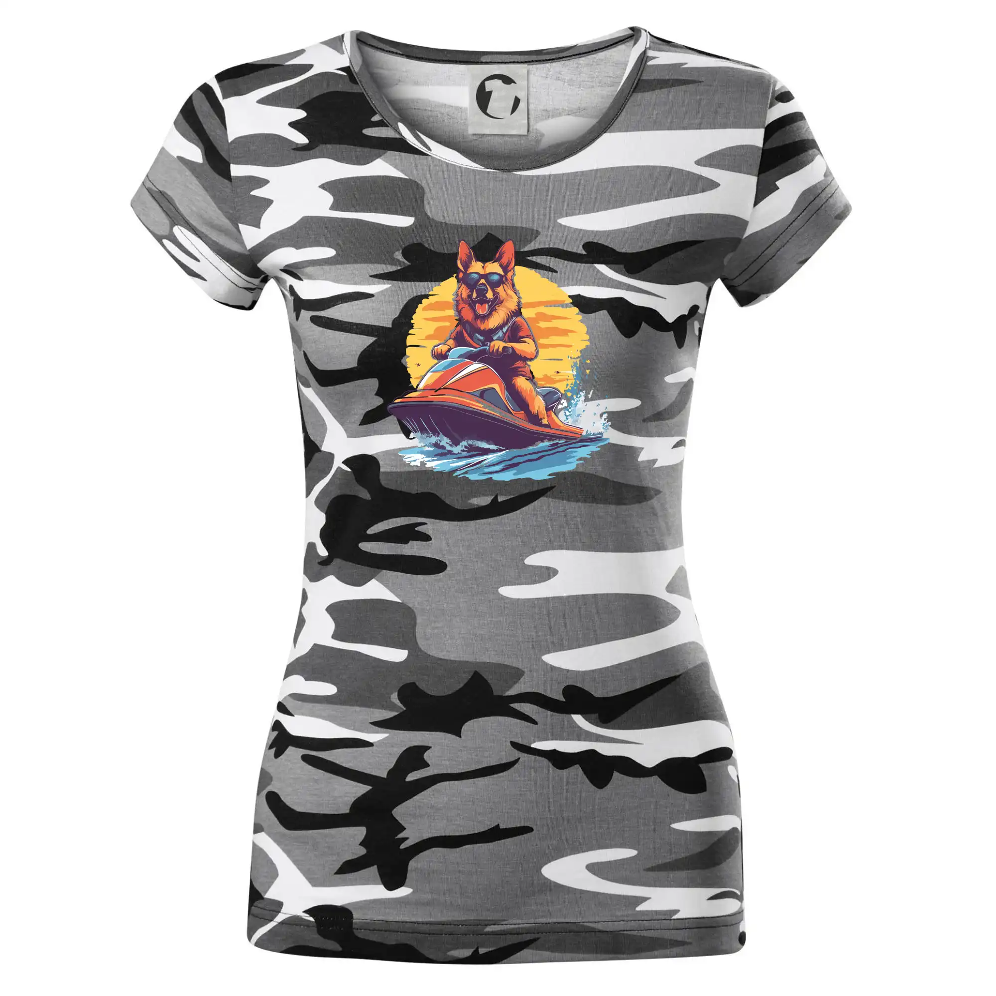 Nemecký ovčiak na vodnom skútri