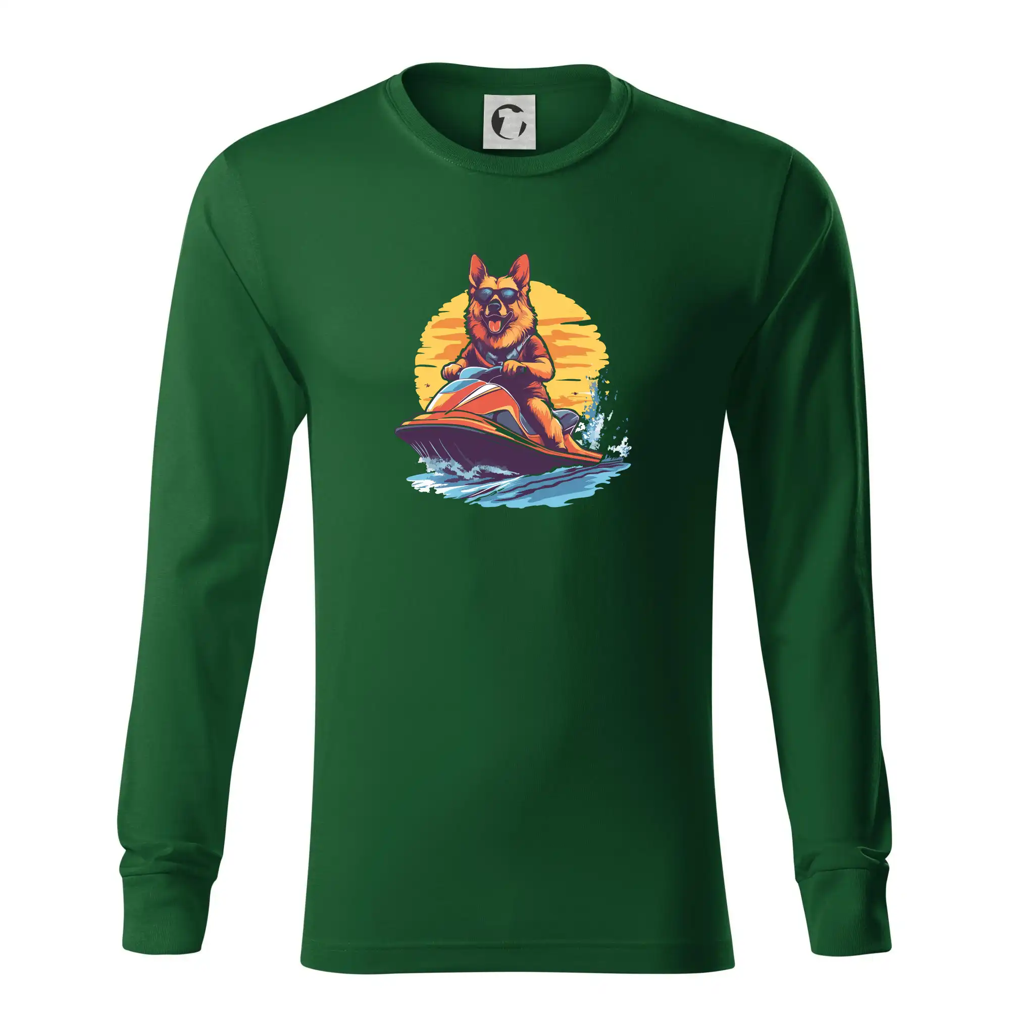 Nemecký ovčiak na vodnom skútri