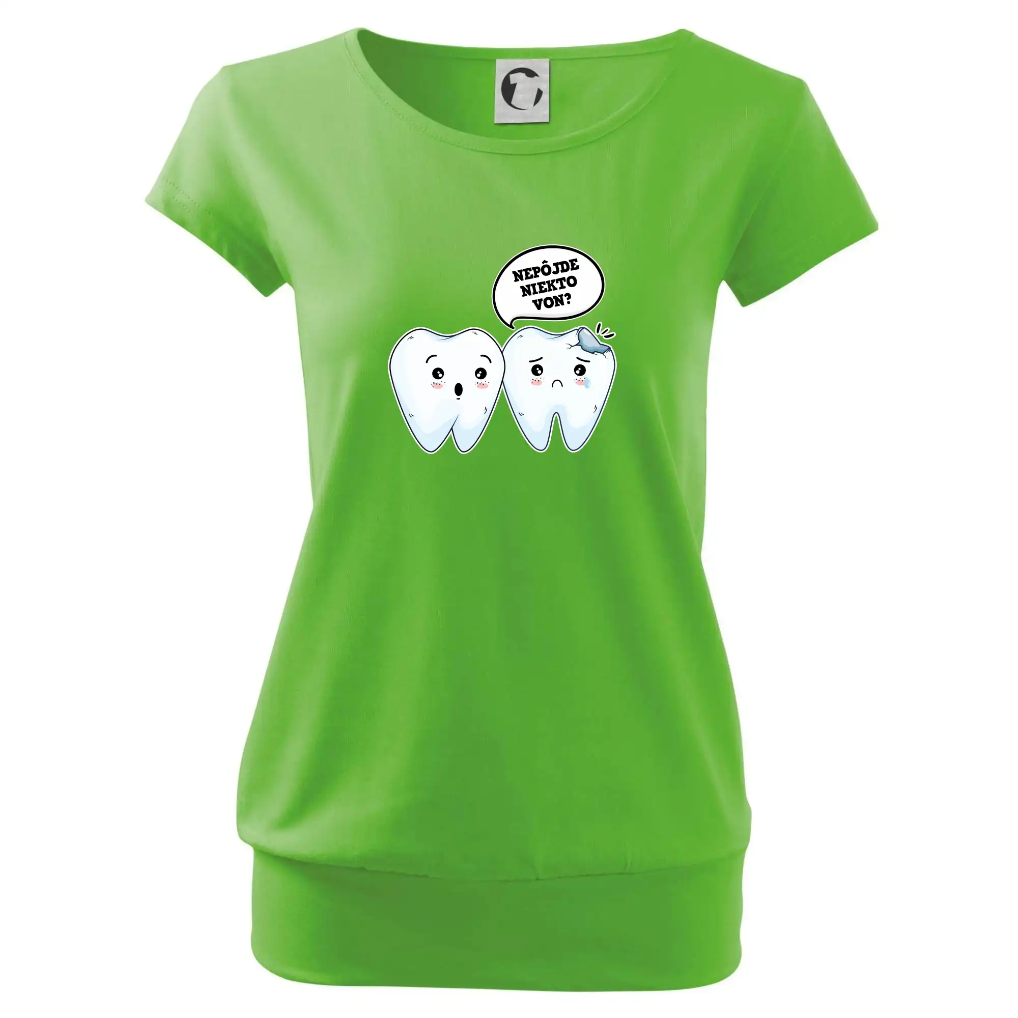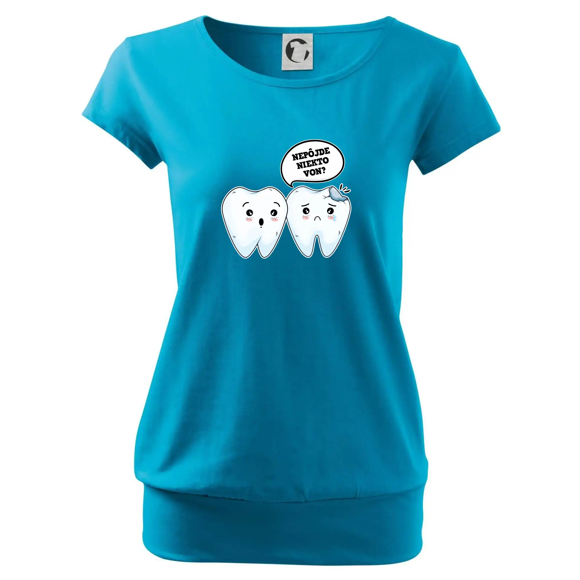 Trendové dámske tričko s veľmi krátkym rukávom, voľnejšieho strihu, v dolnom kraji všité do širokého lemu. Okrúhly priekrčník s úzkym lemom zo zhodného materiálu.