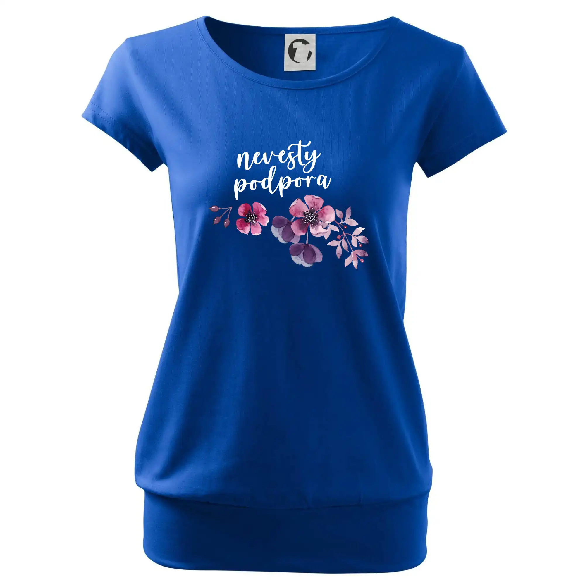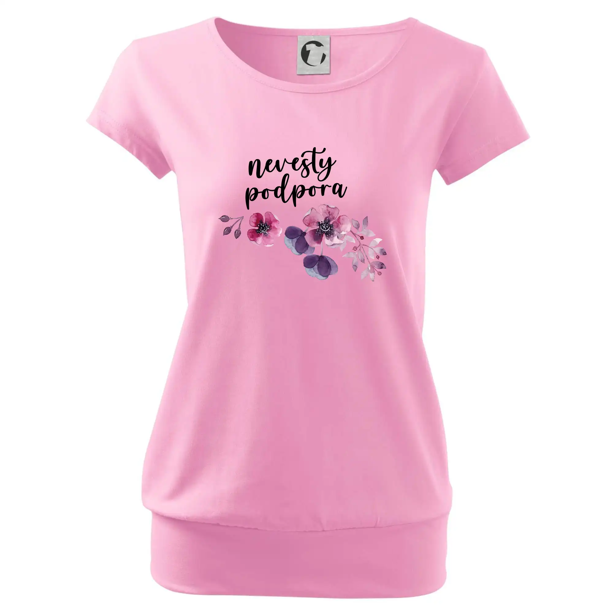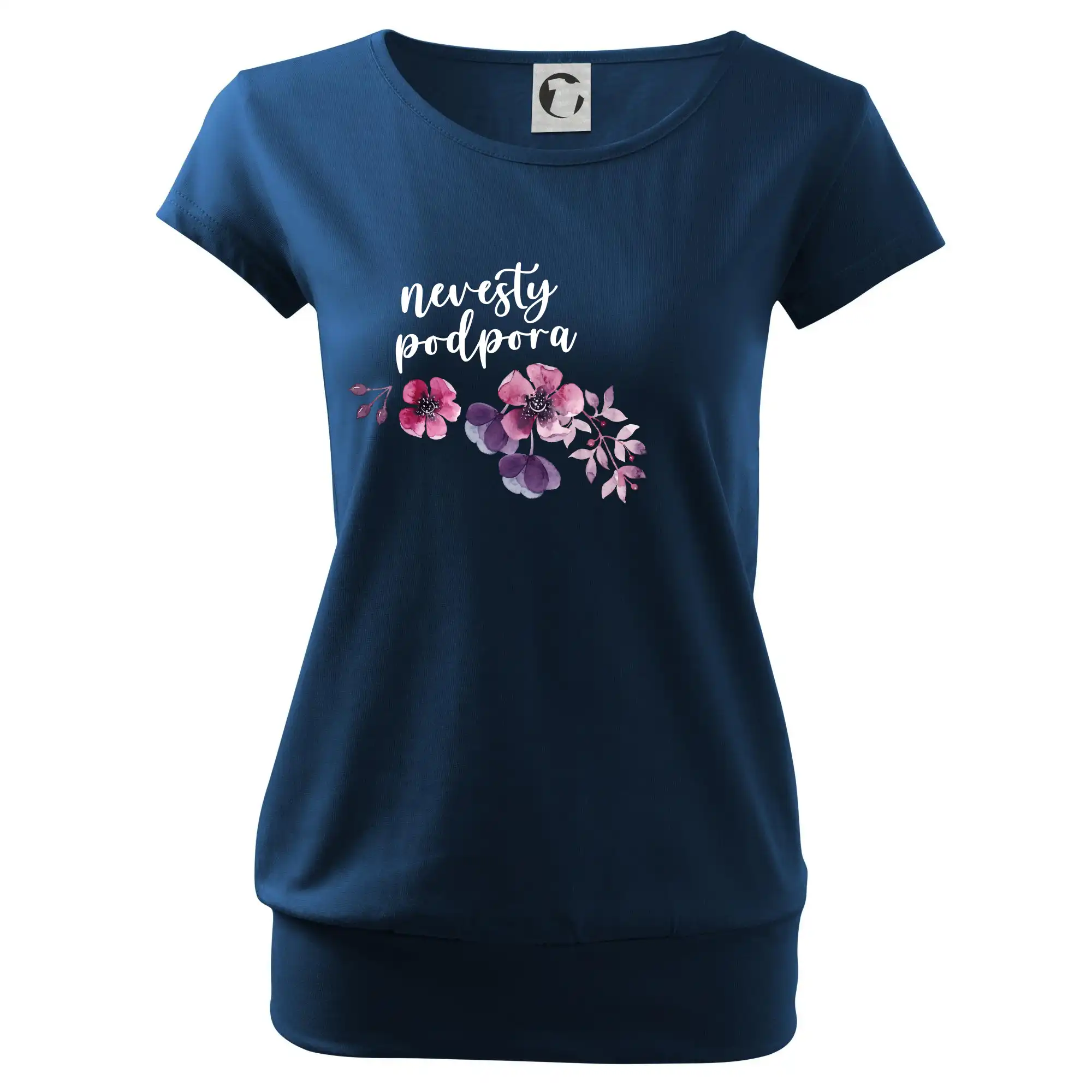 Trendové dámske tričko s veľmi krátkym rukávom, voľnejšieho strihu, v dolnom kraji všité do širokého lemu. Okrúhly priekrčník s úzkym lemom zo zhodného materiálu.