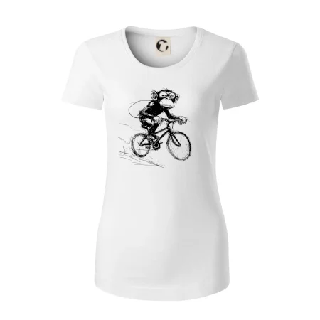 Opice s batohom na bicykli