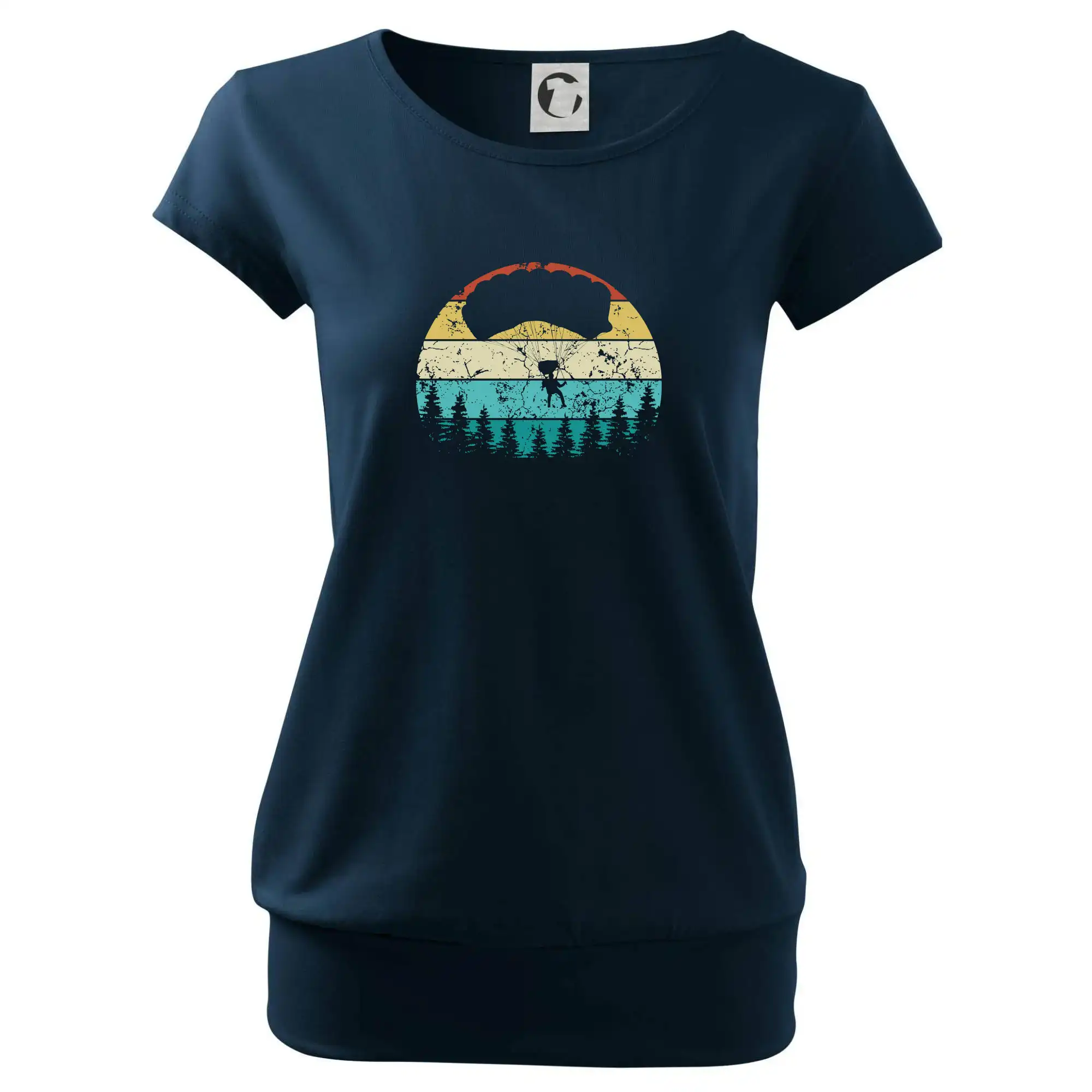 Trendové dámske tričko s veľmi krátkym rukávom, voľnejšieho strihu, v dolnom kraji všité do širokého lemu. Okrúhly priekrčník s úzkym lemom zo zhodného materiálu.