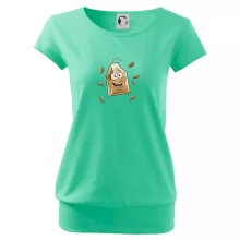 Trendové dámske tričko s veľmi krátkym rukávom, voľnejšieho strihu, v dolnom kraji všité do širokého lemu. Okrúhly priekrčník s úzkym lemom zo zhodného materiálu.