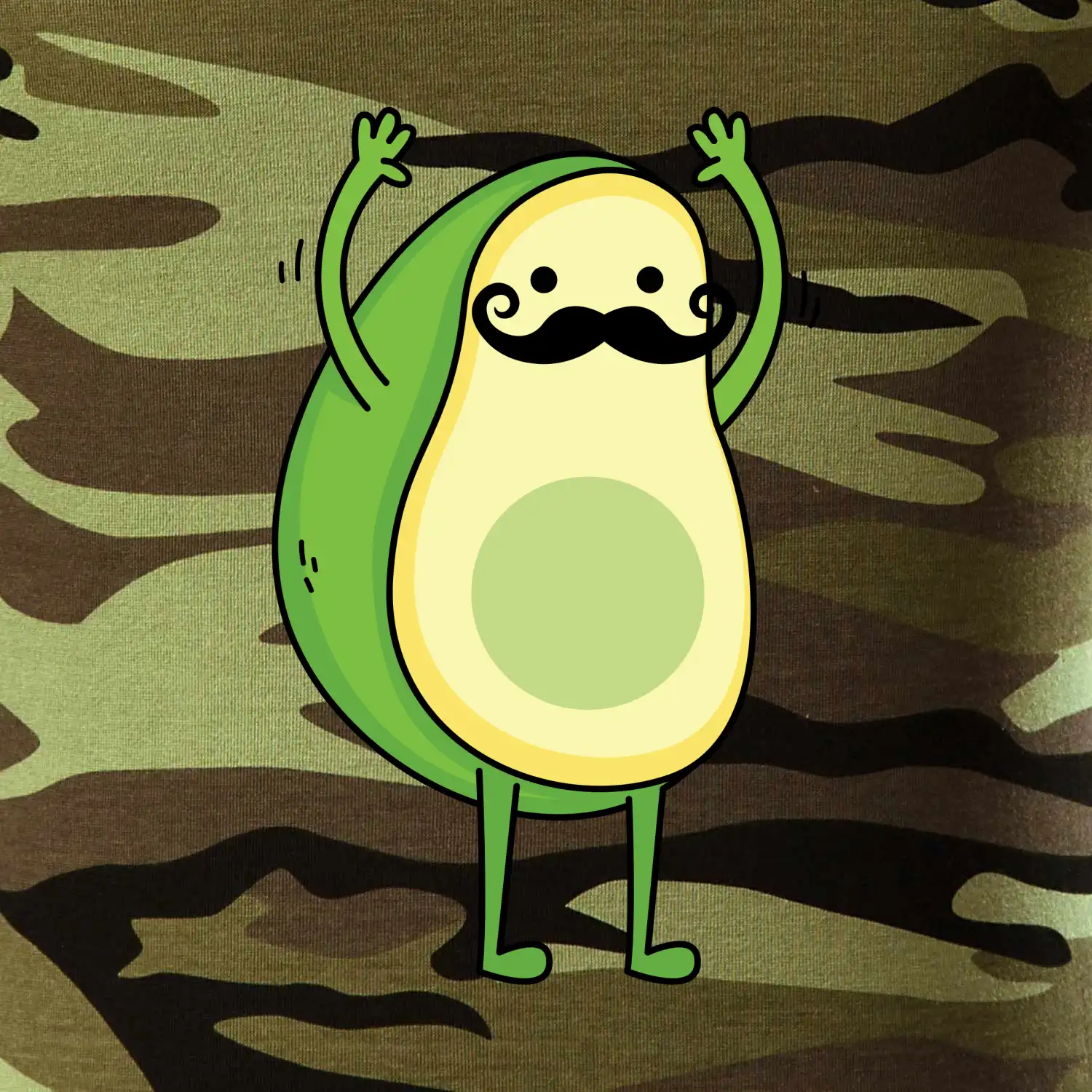 Tričko strednej gramáže vo farbách camouflage. Strih s bočnými švami. Lem priekrčníku z rebrového úpletu s prídavkom 5% elastanu. Vnútorná časť zadného priekrčníka začistená páskou vo farbe camouflage.