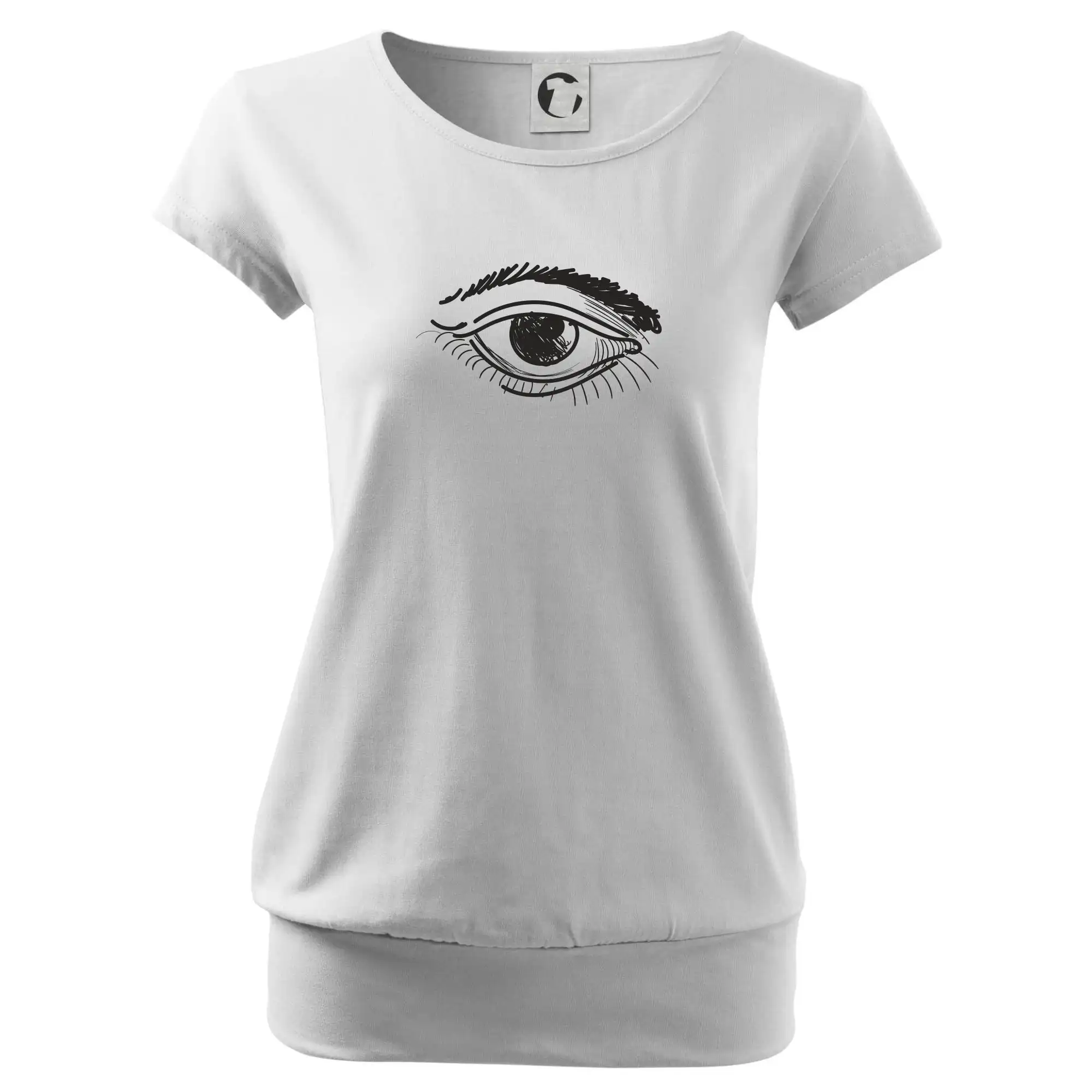 Trendové dámske tričko s veľmi krátkym rukávom, voľnejšieho strihu, v dolnom kraji všité do širokého lemu. Okrúhly priekrčník s úzkym lemom zo zhodného materiálu.