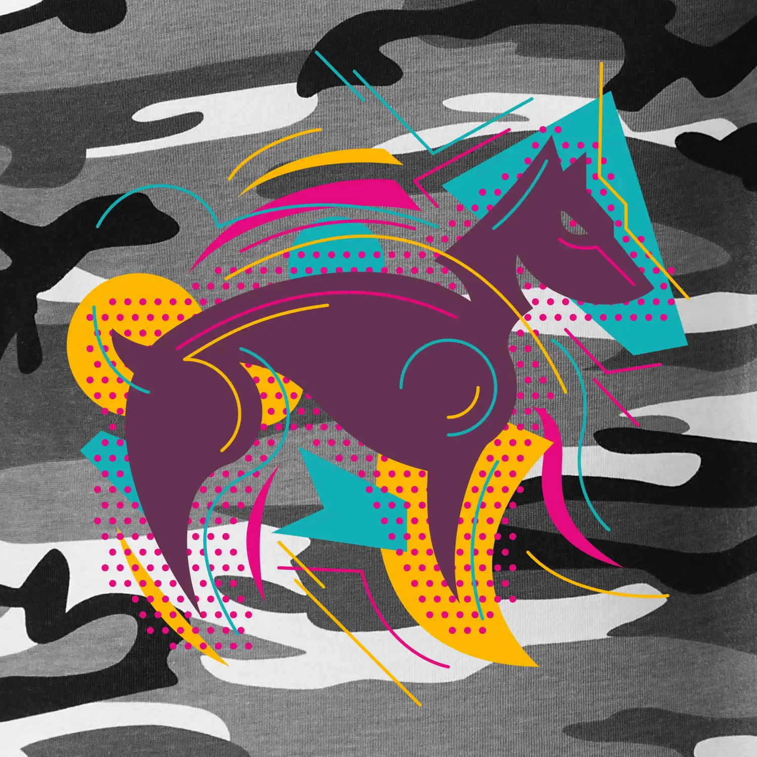 Tričko strednej gramáže vo farbách camouflage. Strih s bočnými švami. Lem priekrčníku z rebrového úpletu s prídavkom 5% elastanu. Vnútorná časť zadného priekrčníka začistená páskou vo farbe camouflage.