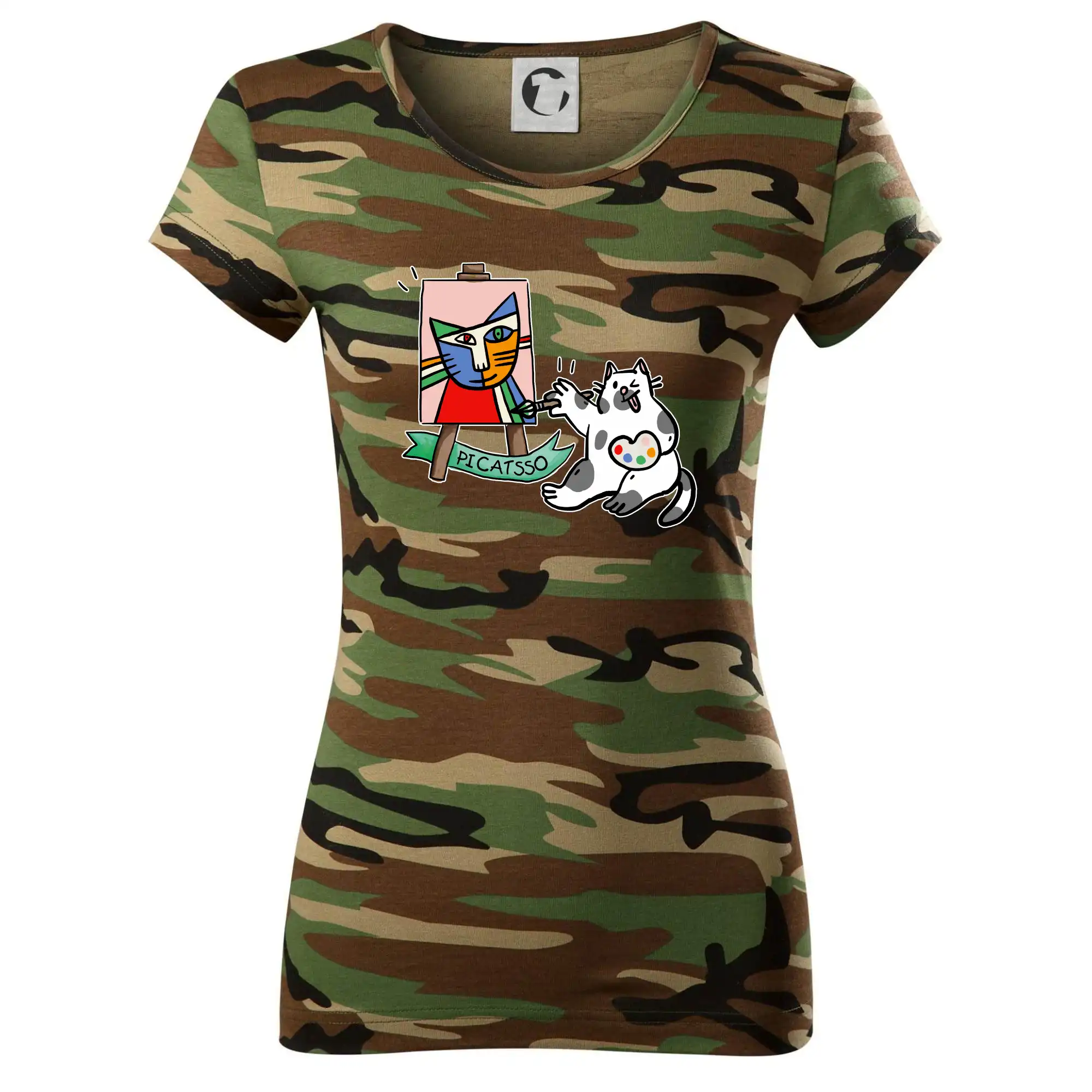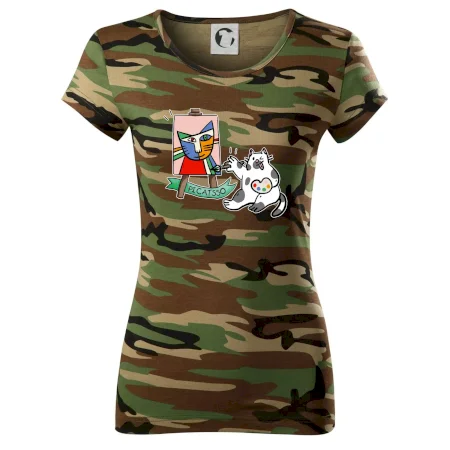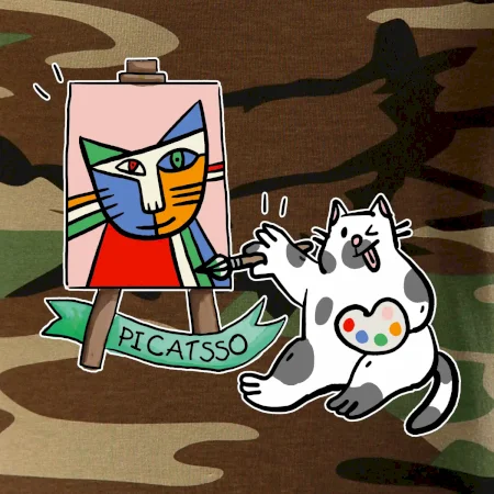 Tričko s kočkou která si věří, že je Pablo Picasso, vtipné triko s kočkou malířkou, která kreslí obraz. S trikem s kočkou nezkazíš žádnou srandu.