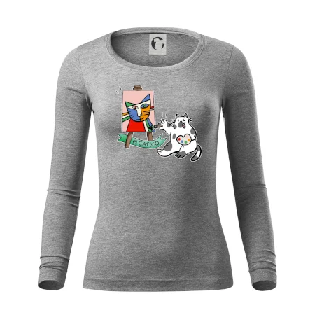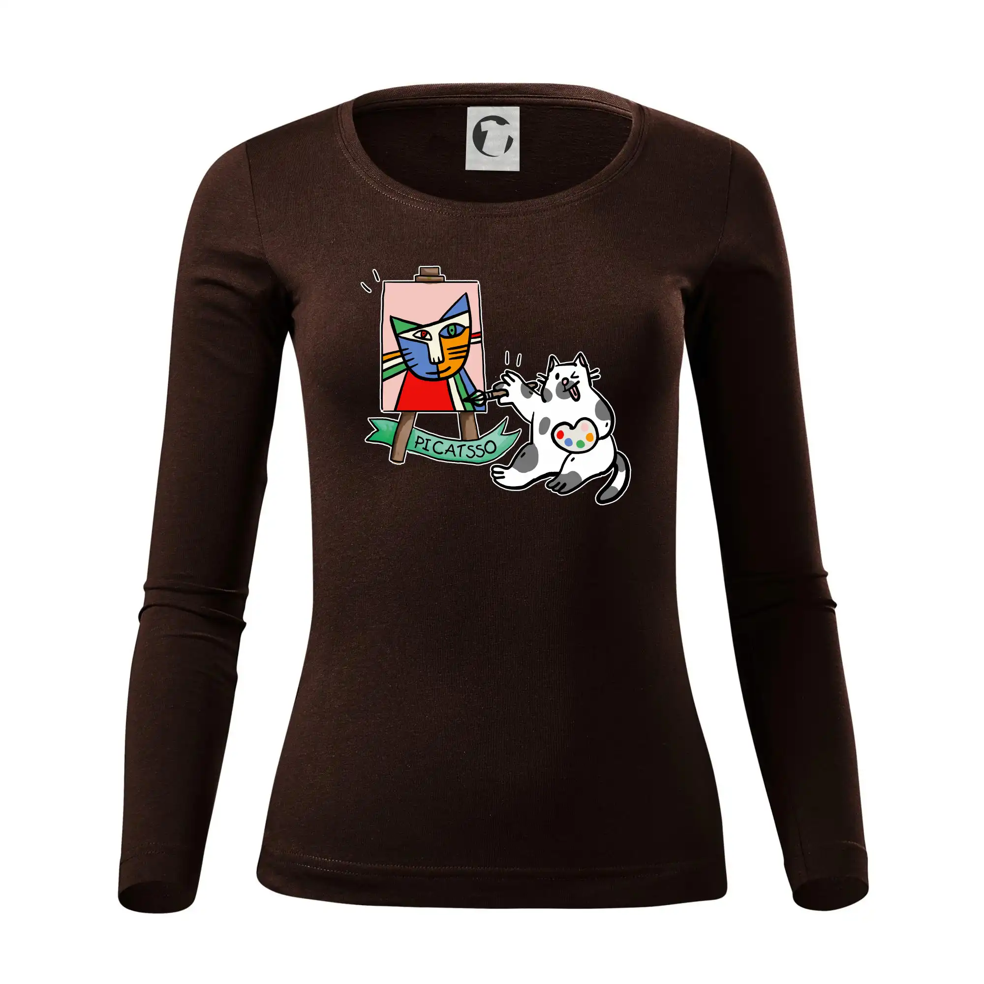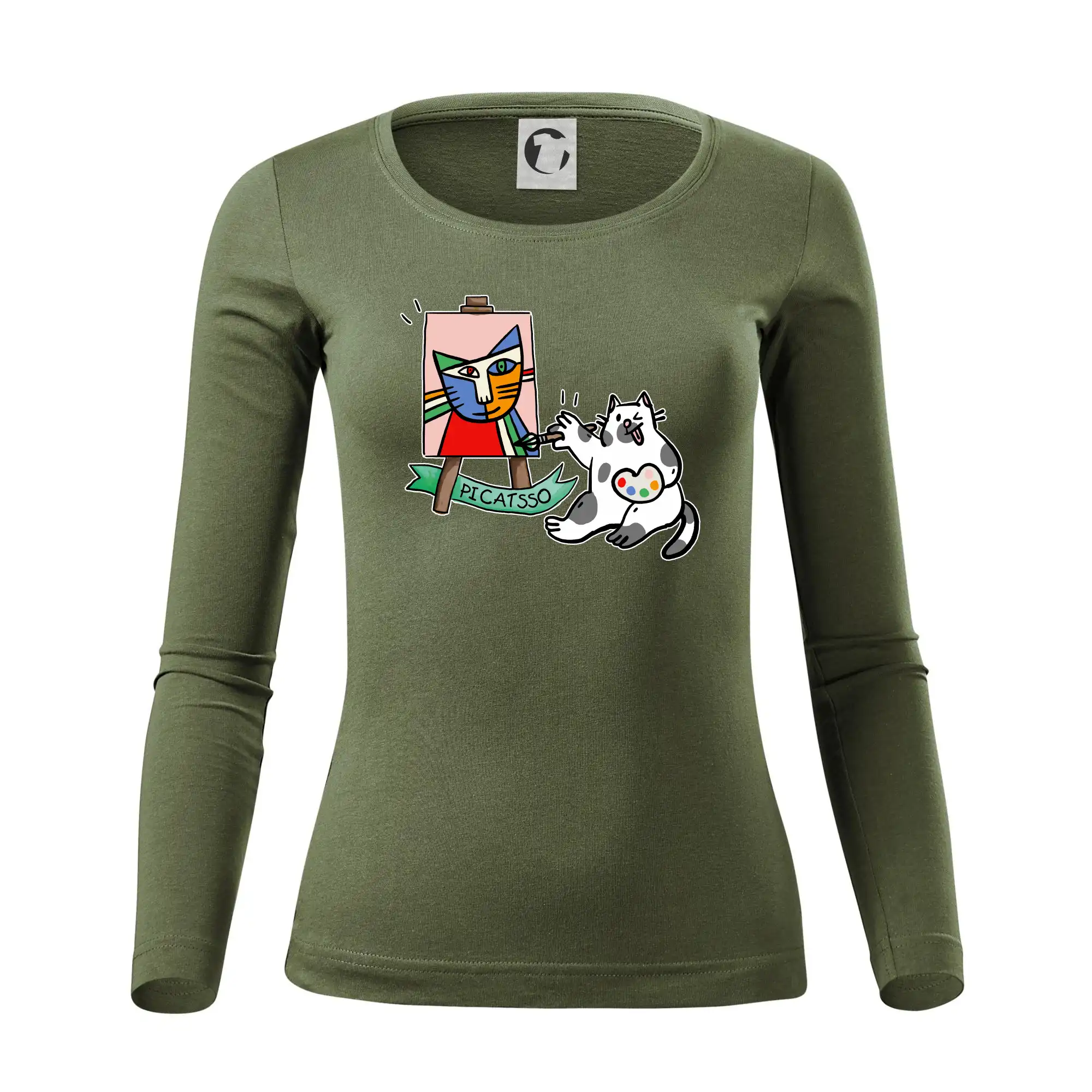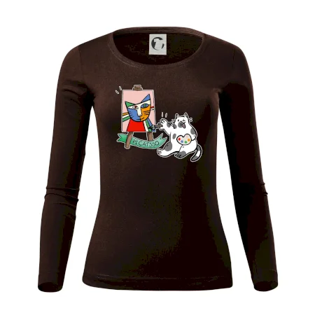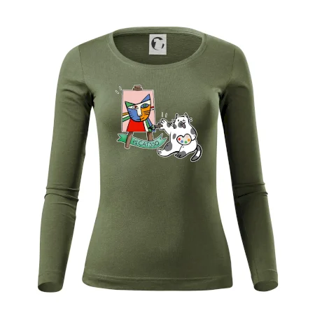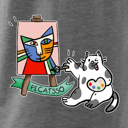 Tričko s kočkou která si věří, že je Pablo Picasso, vtipné triko s kočkou malířkou, která kreslí obraz. S trikem s kočkou nezkazíš žádnou srandu.