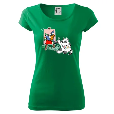 Tričko s kočkou která si věří, že je Pablo Picasso, vtipné triko s kočkou malířkou, která kreslí obraz. S trikem s kočkou nezkazíš žádnou srandu.