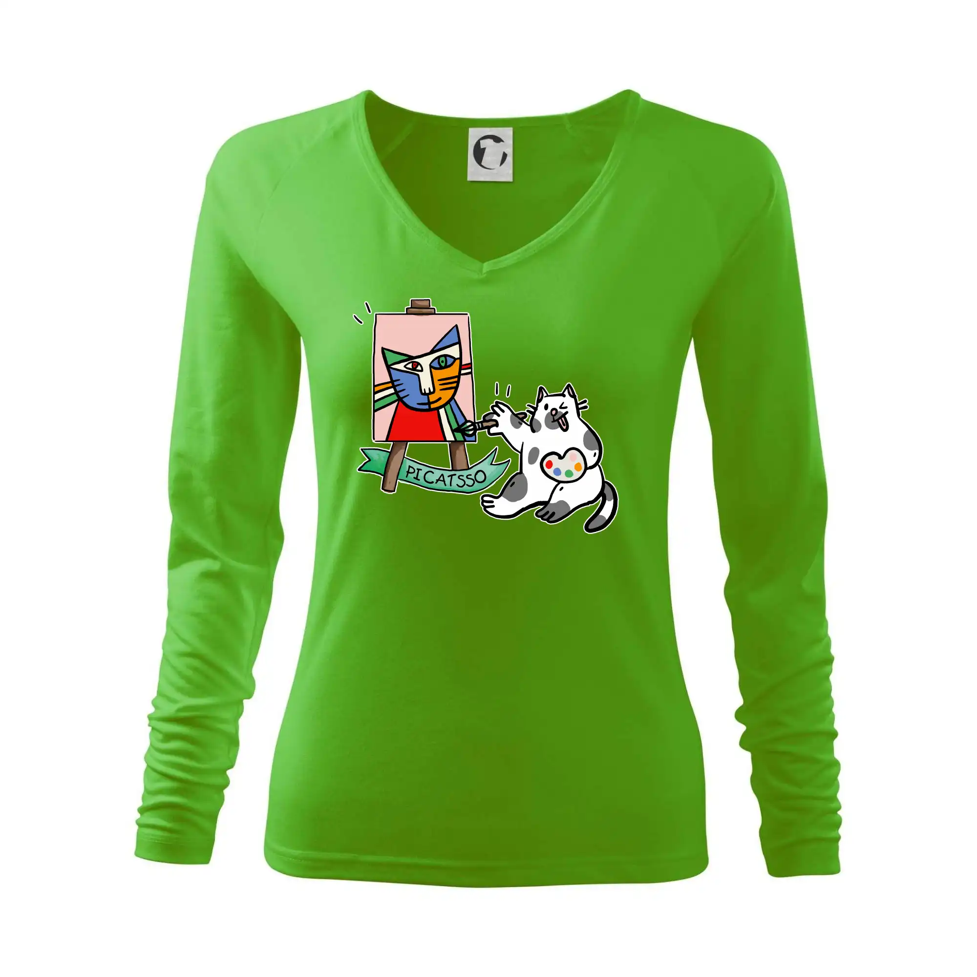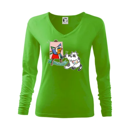 Tričko s kočkou která si věří, že je Pablo Picasso, vtipné triko s kočkou malířkou, která kreslí obraz. S trikem s kočkou nezkazíš žádnou srandu.