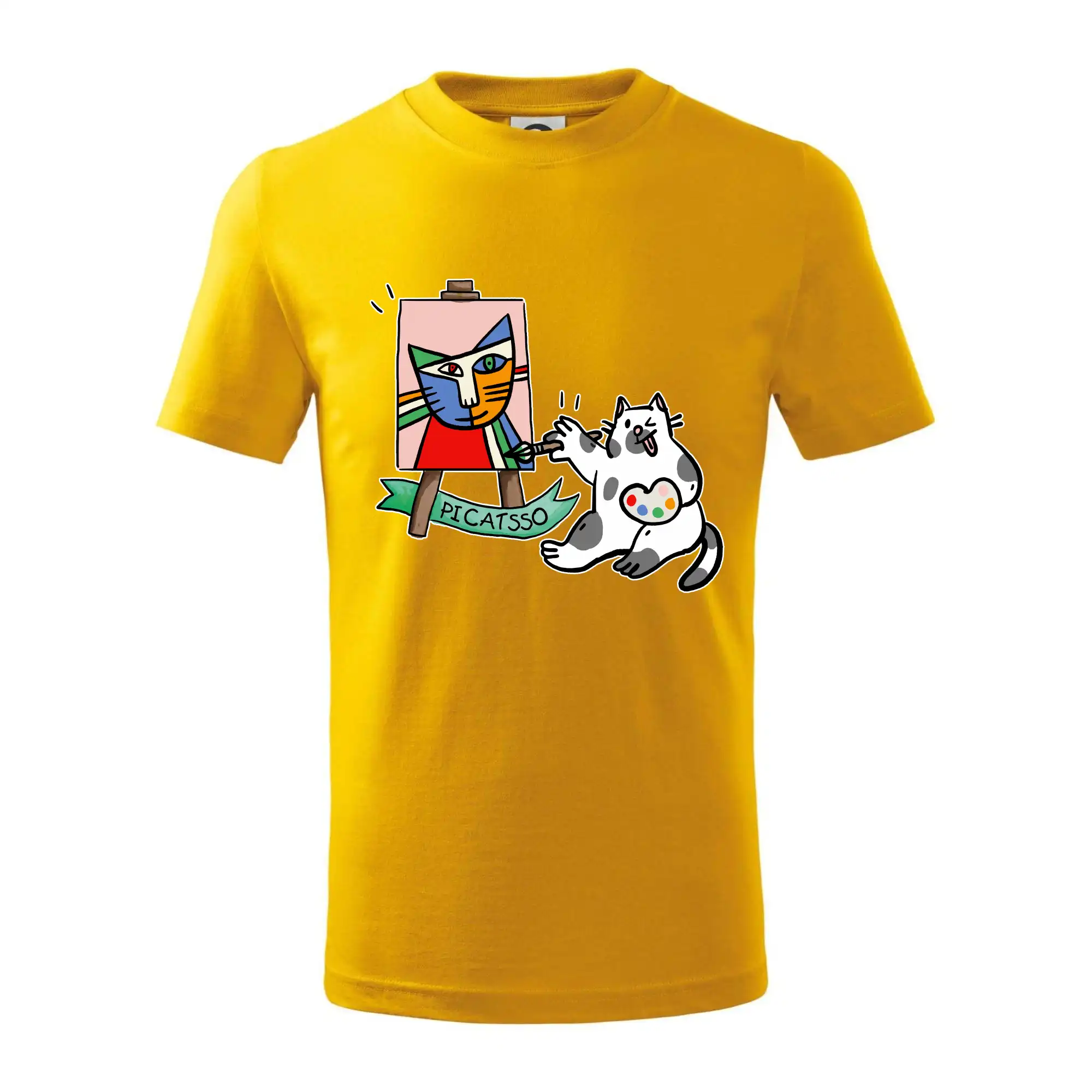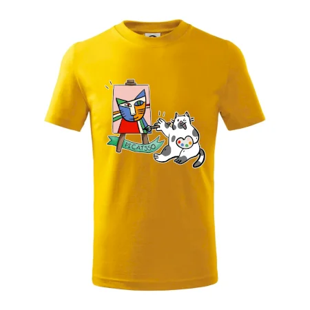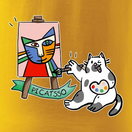 Tričko s kočkou která si věří, že je Pablo Picasso, vtipné triko s kočkou malířkou, která kreslí obraz. S trikem s kočkou nezkazíš žádnou srandu.