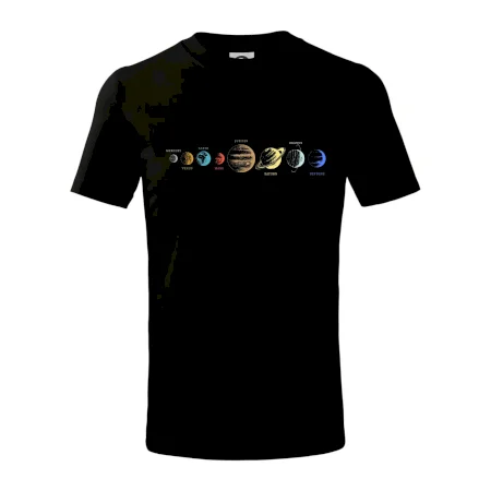Detské tričko strednej gramáže s bočnými švami. Úzky priekrčník s prídavkom 5% elastanu. Vnútorná časť zadného priekrčníka začistená tkanou páskou. Spevnený ramenný šev.