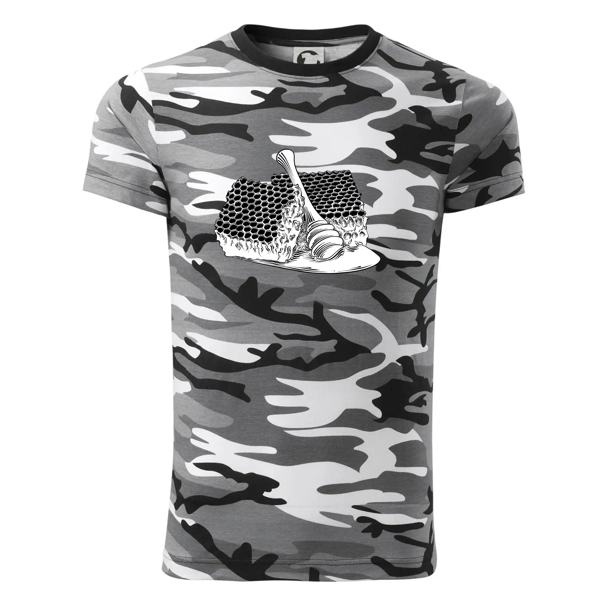 Tričko strednej gramáže vo farbách camouflage. Strih s bočnými švami. Lem priekrčníku z rebrového úpletu s prídavkom 5% elastanu. Vnútorná časť zadného priekrčníka začistená páskou vo farbe camouflage.