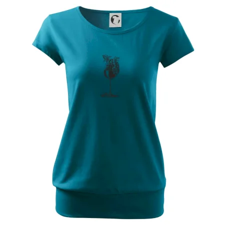 Trendové dámske tričko s veľmi krátkym rukávom, voľnejšieho strihu, v dolnom kraji všité do širokého lemu. Okrúhly priekrčník s úzkym lemom zo zhodného materiálu.