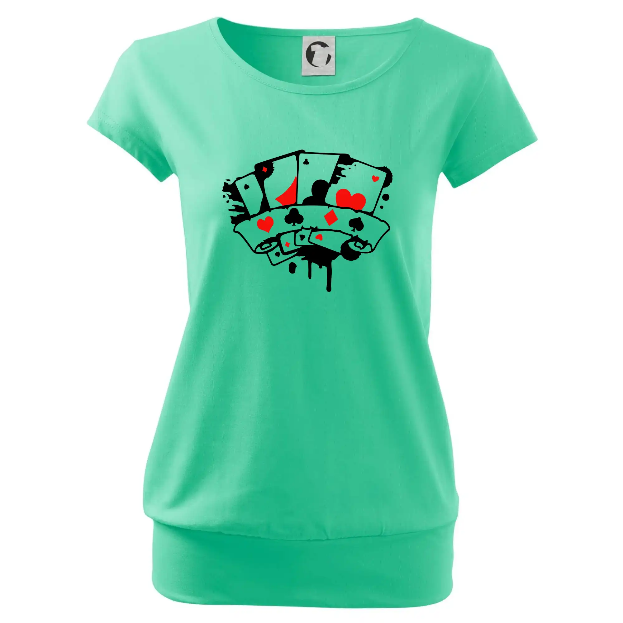 Trendové dámske tričko s veľmi krátkym rukávom, voľnejšieho strihu, v dolnom kraji všité do širokého lemu. Okrúhly priekrčník s úzkym lemom zo zhodného materiálu.