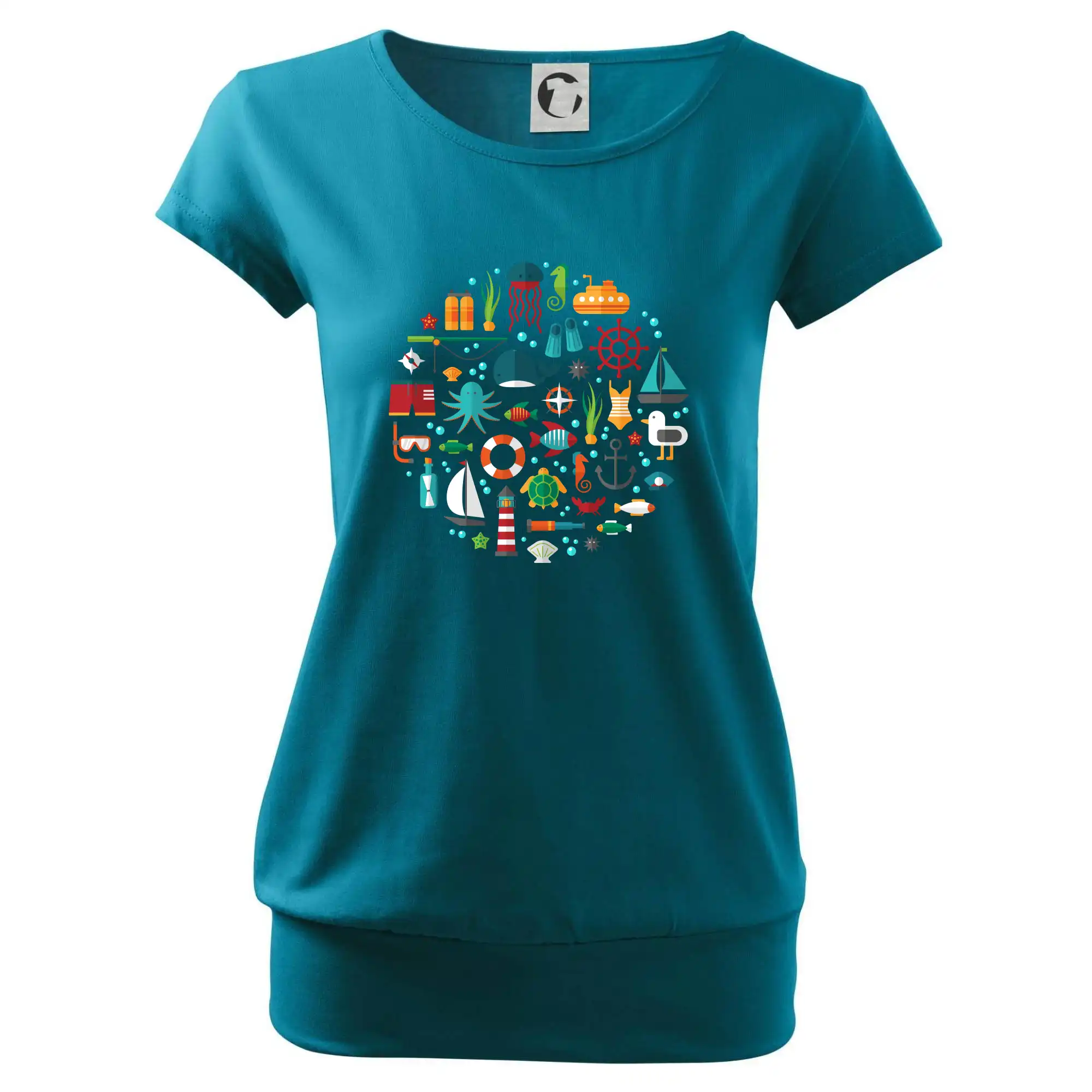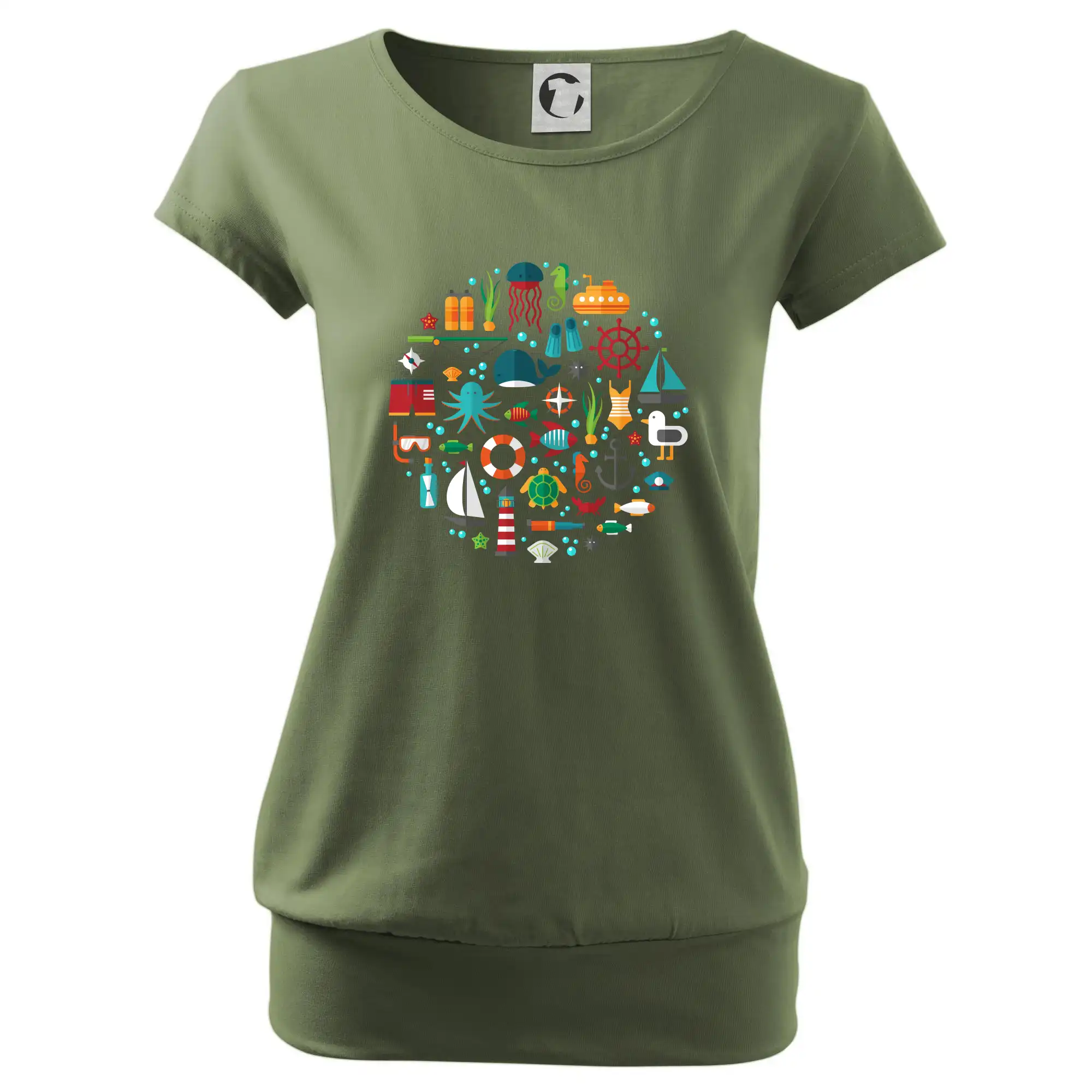 Trendové dámske tričko s veľmi krátkym rukávom, voľnejšieho strihu, v dolnom kraji všité do širokého lemu. Okrúhly priekrčník s úzkym lemom zo zhodného materiálu.