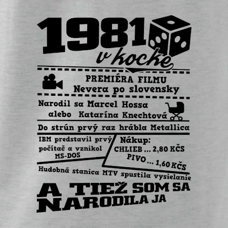 Narodeninové tričko pre ročník 1981. Zháňaš originálny darček? Tričko pre ročník 1981 v kocke je ten najlepší darček, ktorým určite potešíš. Koľko čo stálo? Kto bol prezident? Kto sa narodil? Všetko toto a ešte oveľa viac nájdeš na našom narodeninovom triku!