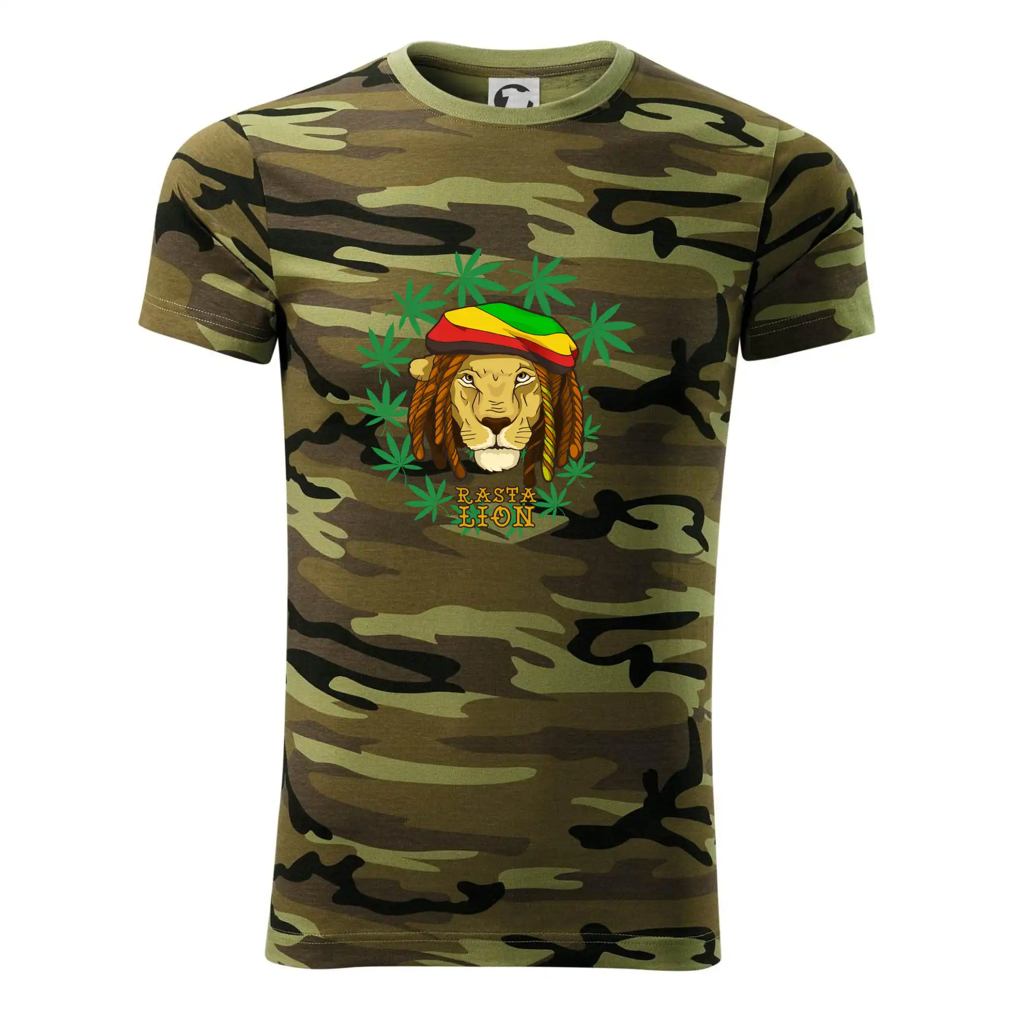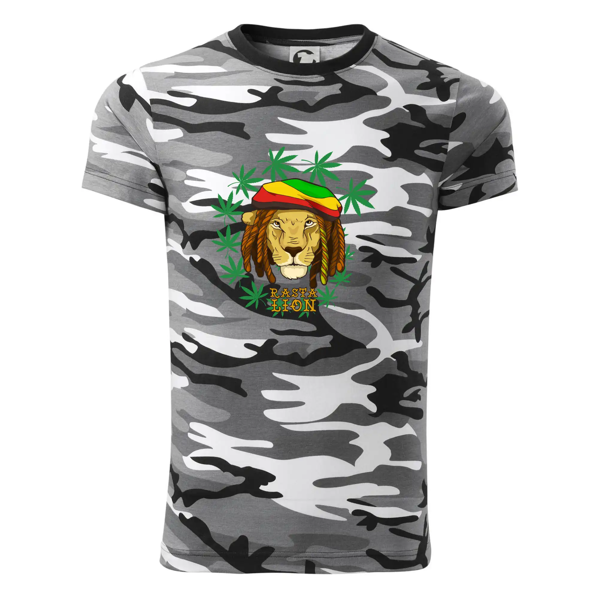 Tričko strednej gramáže vo farbách camouflage. Strih s bočnými švami. Lem priekrčníku z rebrového úpletu s prídavkom 5% elastanu. Vnútorná časť zadného priekrčníka začistená páskou vo farbe camouflage.