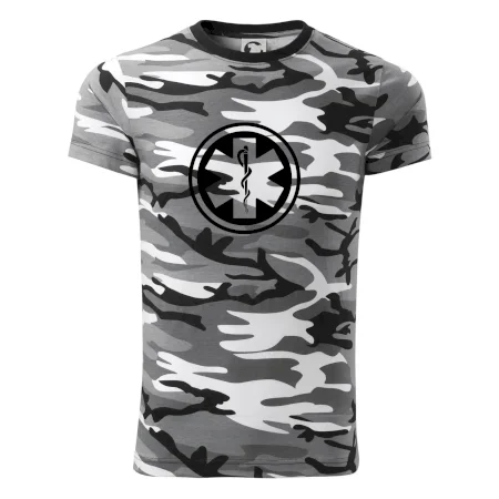Tričko strednej gramáže vo farbách camouflage. Strih s bočnými švami. Lem priekrčníku z rebrového úpletu s prídavkom 5% elastanu. Vnútorná časť zadného priekrčníka začistená páskou vo farbe camouflage.