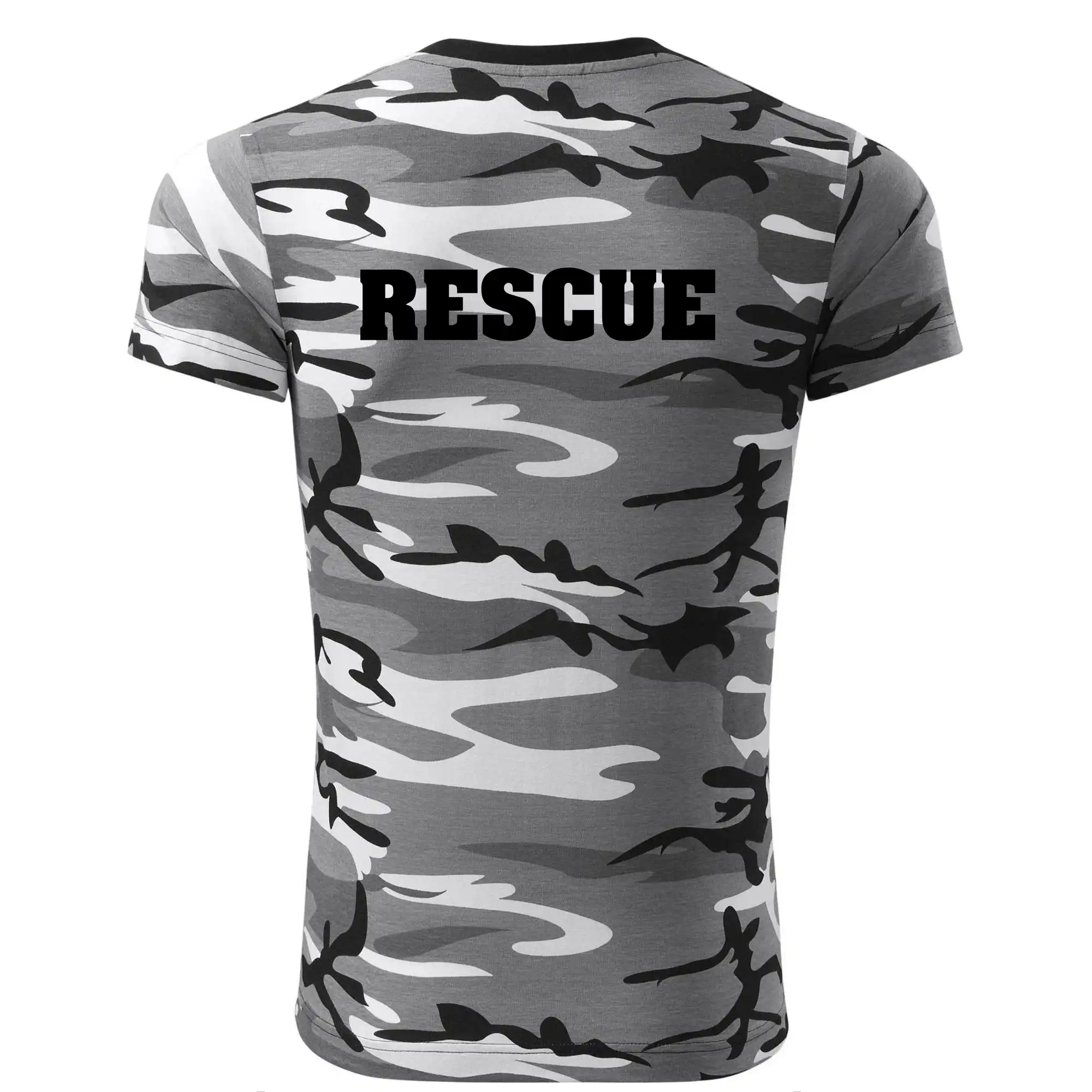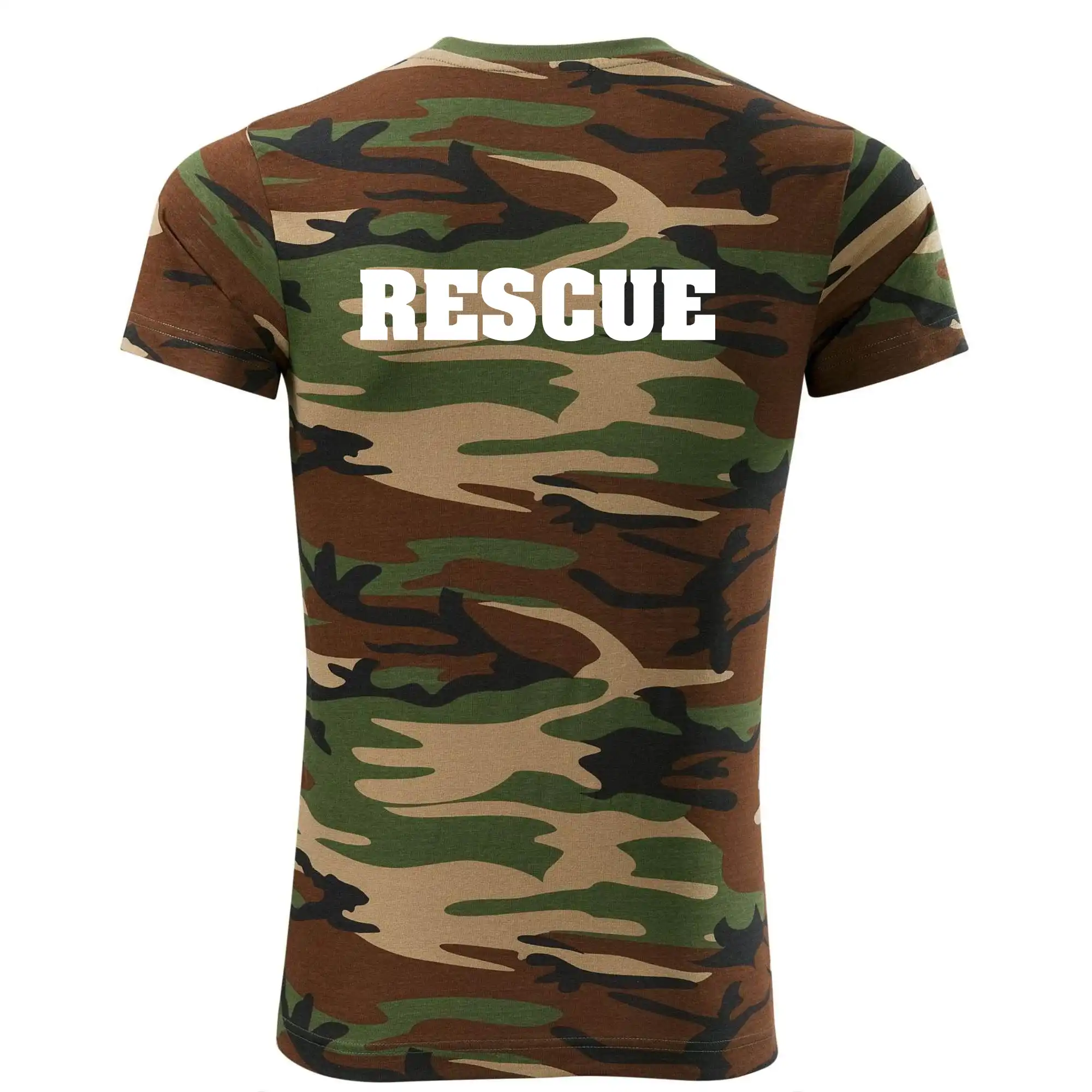 Tričko strednej gramáže vo farbách camouflage. Strih s bočnými švami. Lem priekrčníku z rebrového úpletu s prídavkom 5% elastanu. Vnútorná časť zadného priekrčníka začistená páskou vo farbe camouflage.