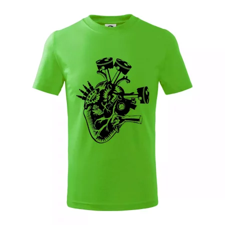 Detské tričko strednej gramáže s bočnými švami. Úzky priekrčník s prídavkom 5% elastanu. Vnútorná časť zadného priekrčníka začistená tkanou páskou. Spevnený ramenný šev.