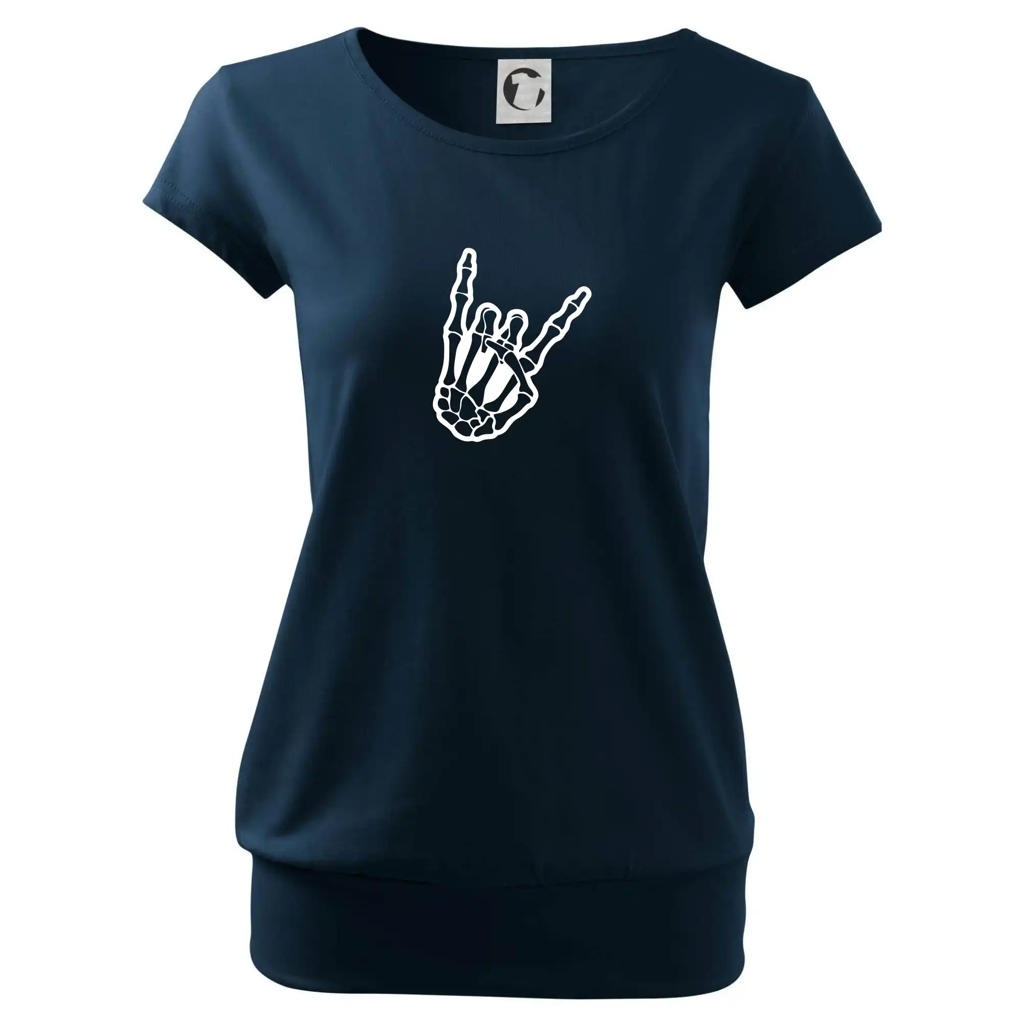 Trendové dámske tričko s veľmi krátkym rukávom, voľnejšieho strihu, v dolnom kraji všité do širokého lemu. Okrúhly priekrčník s úzkym lemom zo zhodného materiálu.