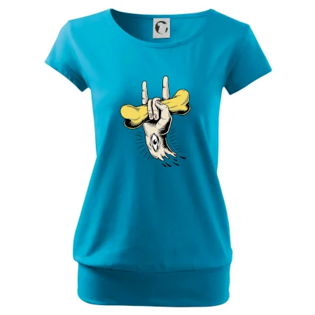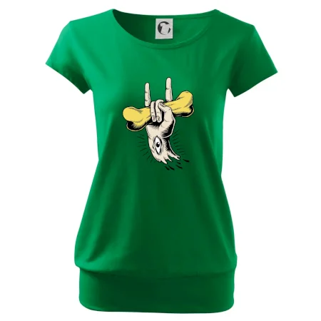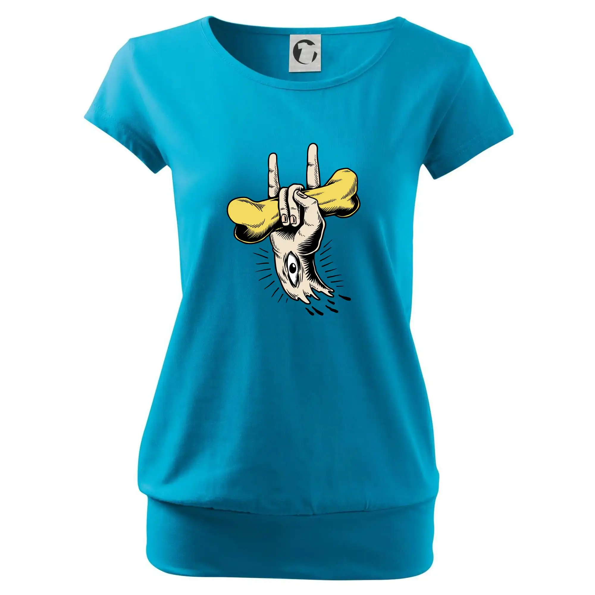Trendové dámske tričko s veľmi krátkym rukávom, voľnejšieho strihu, v dolnom kraji všité do širokého lemu. Okrúhly priekrčník s úzkym lemom zo zhodného materiálu.