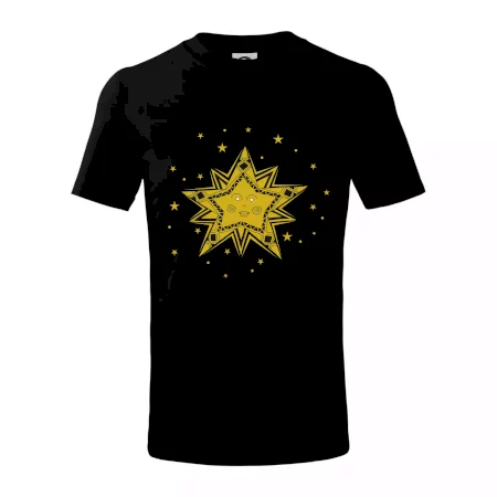 Detské tričko strednej gramáže s bočnými švami. Úzky priekrčník s prídavkom 5% elastanu. Vnútorná časť zadného priekrčníka začistená tkanou páskou. Spevnený ramenný šev.
