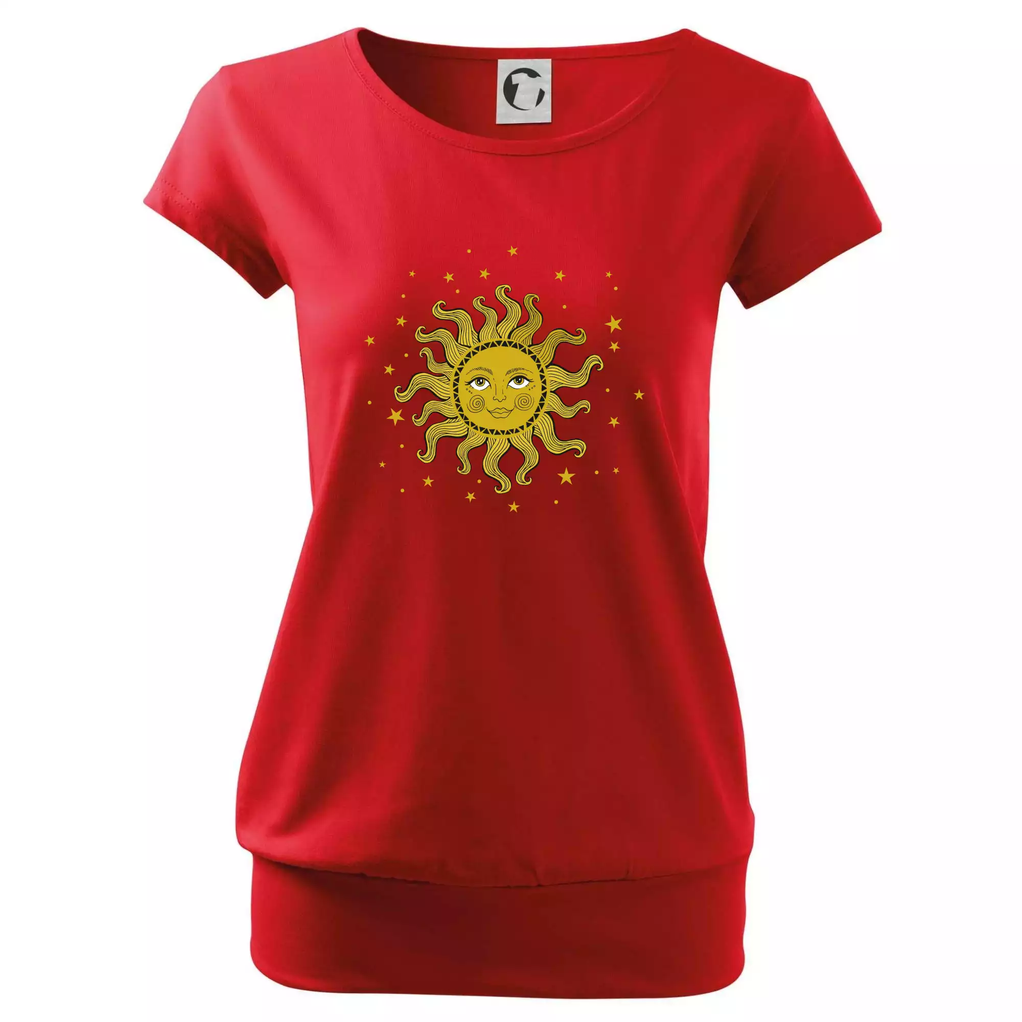 Trendové dámske tričko s veľmi krátkym rukávom, voľnejšieho strihu, v dolnom kraji všité do širokého lemu. Okrúhly priekrčník s úzkym lemom zo zhodného materiálu.