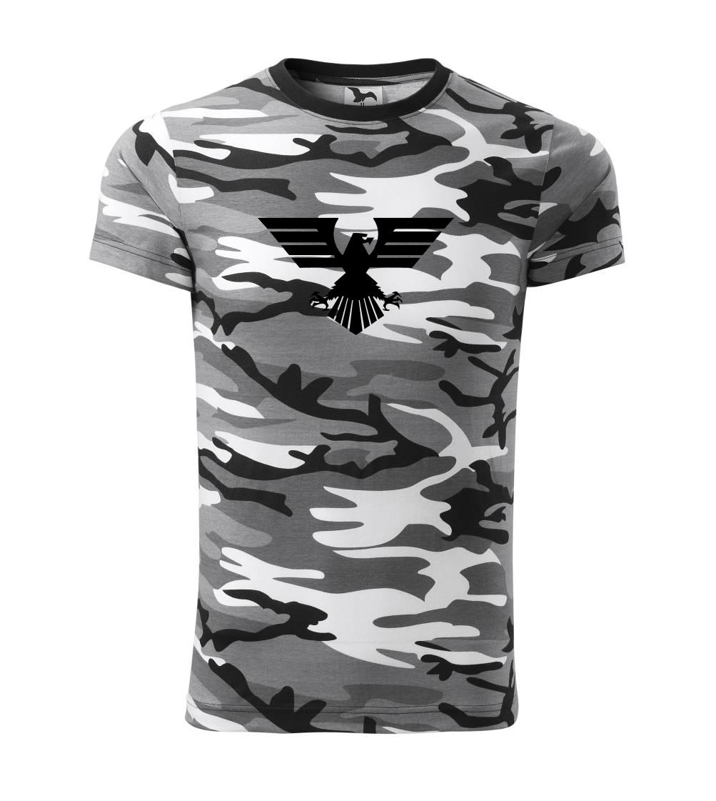 Tričko strednej gramáže vo farbách camouflage. Strih s bočnými švami. Lem priekrčníku z rebrového úpletu s prídavkom 5% elastanu. Vnútorná časť zadného priekrčníka začistená páskou vo farbe camouflage.