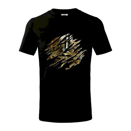 Detské tričko strednej gramáže s bočnými švami. Úzky priekrčník s prídavkom 5% elastanu. Vnútorná časť zadného priekrčníka začistená tkanou páskou. Spevnený ramenný šev.