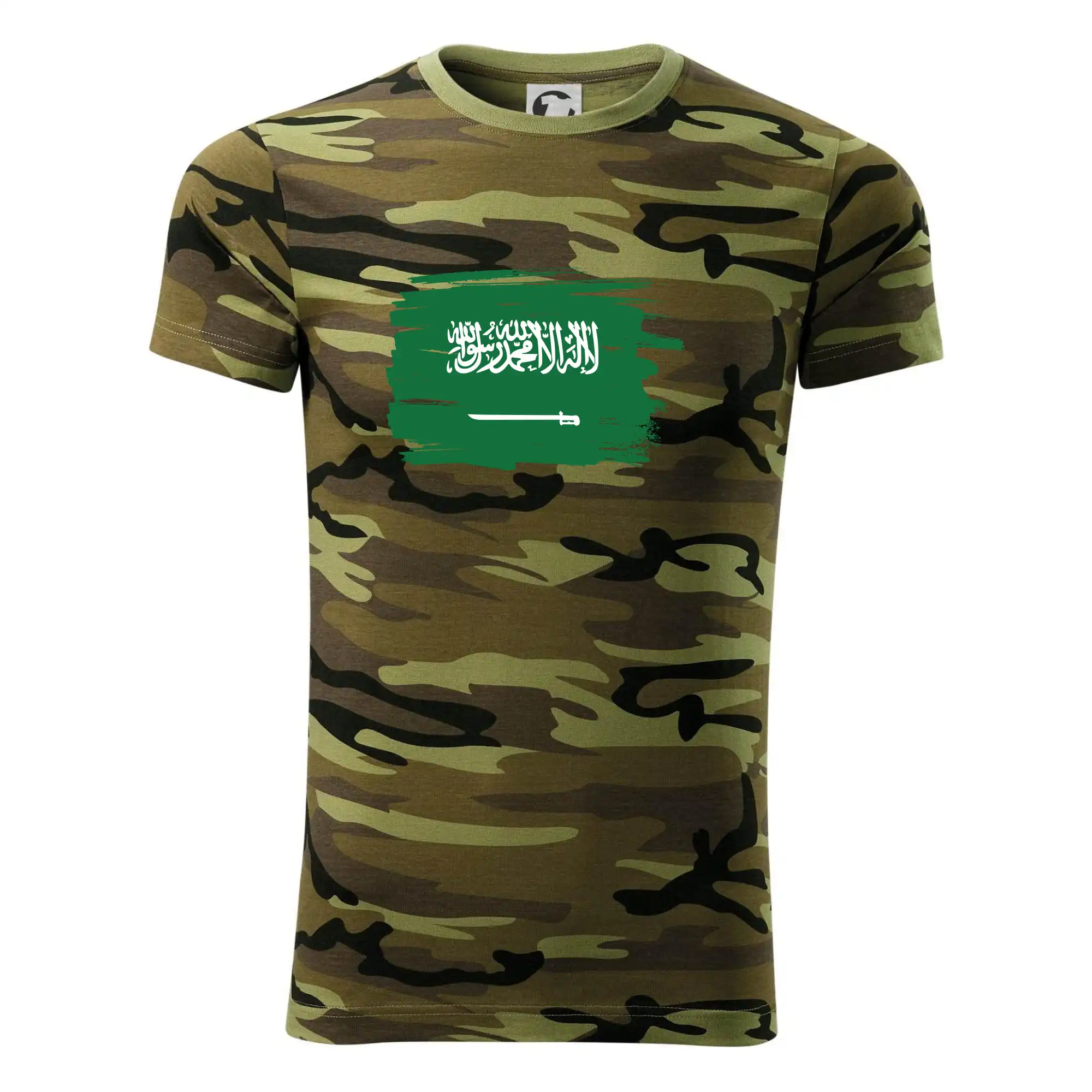 Tričko strednej gramáže vo farbách camouflage. Strih s bočnými švami. Lem priekrčníku z rebrového úpletu s prídavkom 5% elastanu. Vnútorná časť zadného priekrčníka začistená páskou vo farbe camouflage.