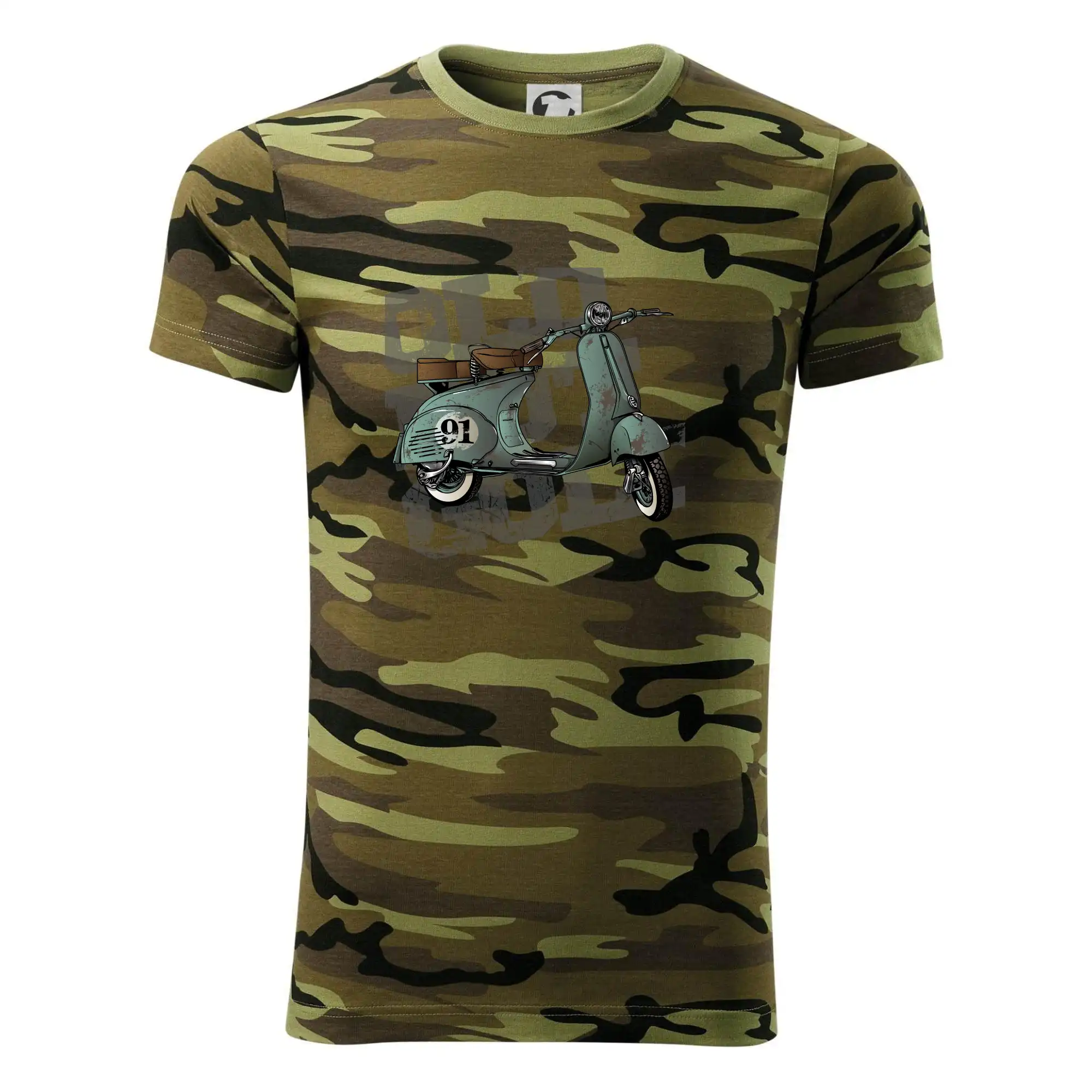 Tričko strednej gramáže vo farbách camouflage. Strih s bočnými švami. Lem priekrčníku z rebrového úpletu s prídavkom 5% elastanu. Vnútorná časť zadného priekrčníka začistená páskou vo farbe camouflage.